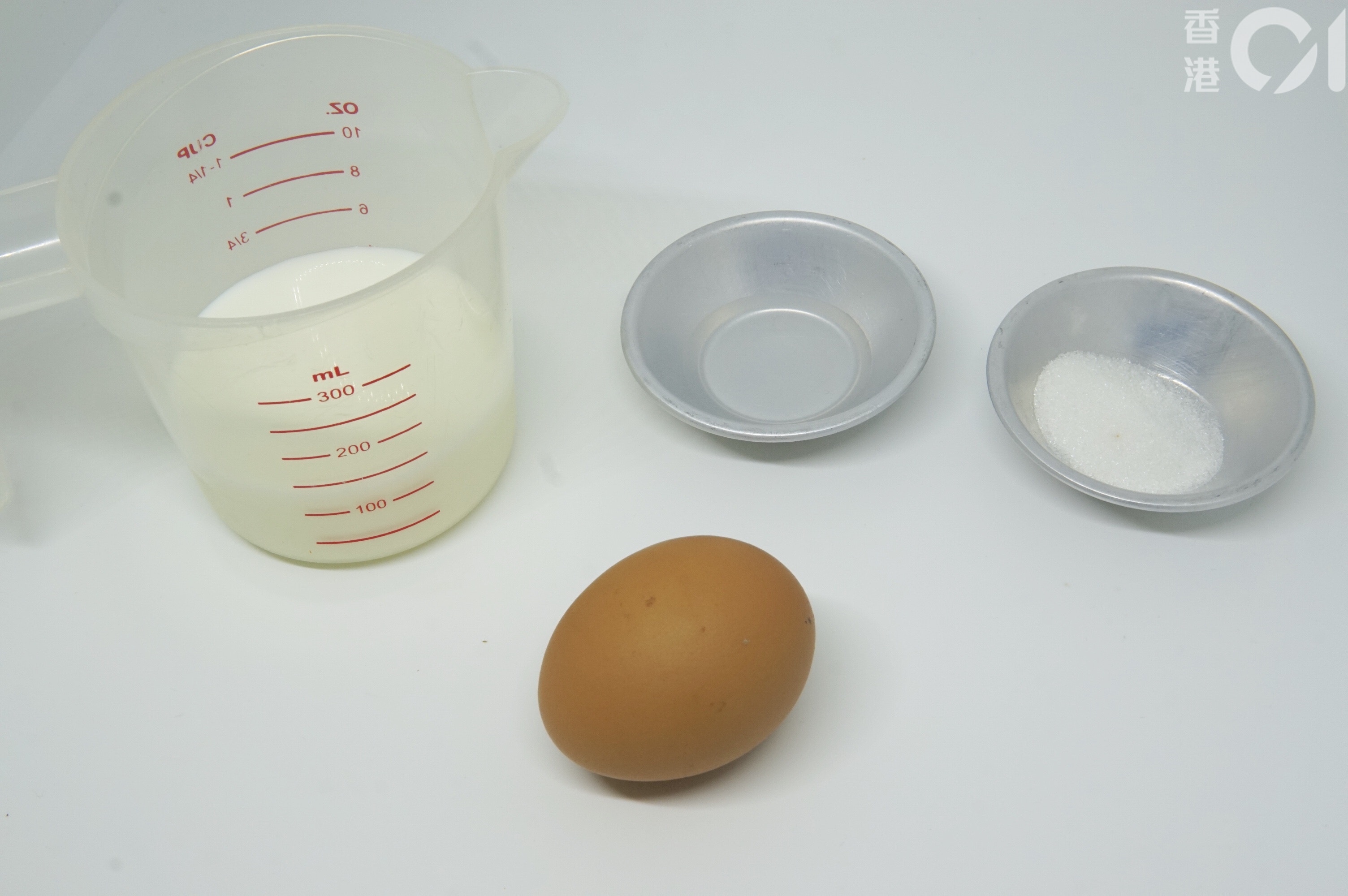 所需材料:室溫雞蛋1隻、糖3湯匙、水2茶匙、牛奶120毫升