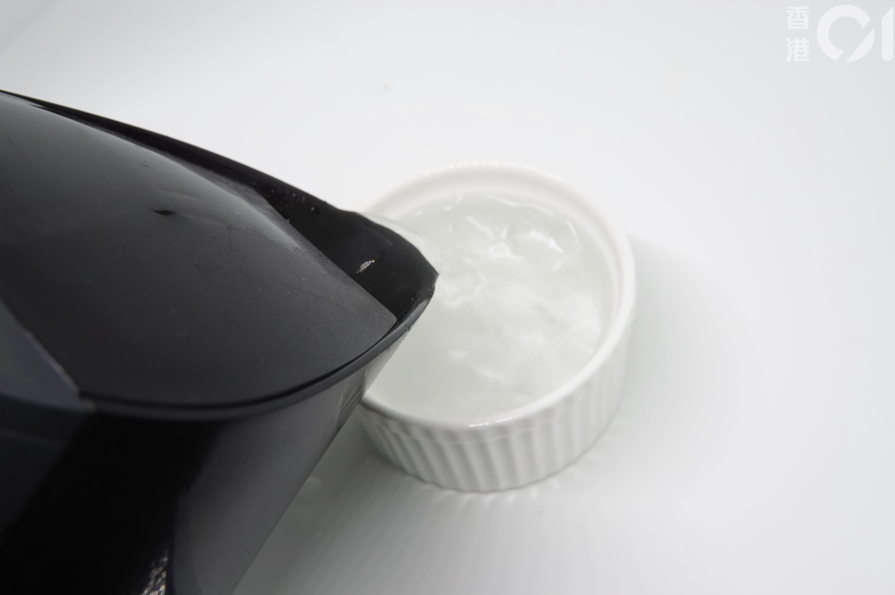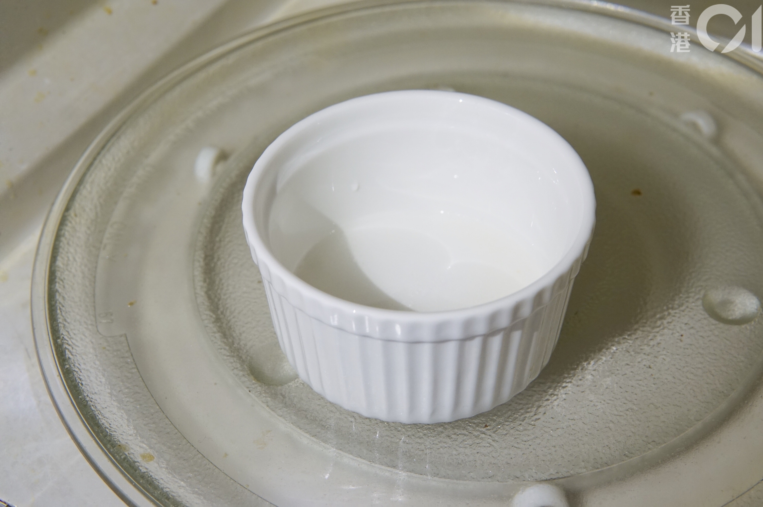 倒進可放入微波爐的容器內,用茶水間隨手找來的碗碟便可,不一定要用專業的蛋糕模。(ViuTV《晚吹 - 空肚講宵夜》節目截圖)