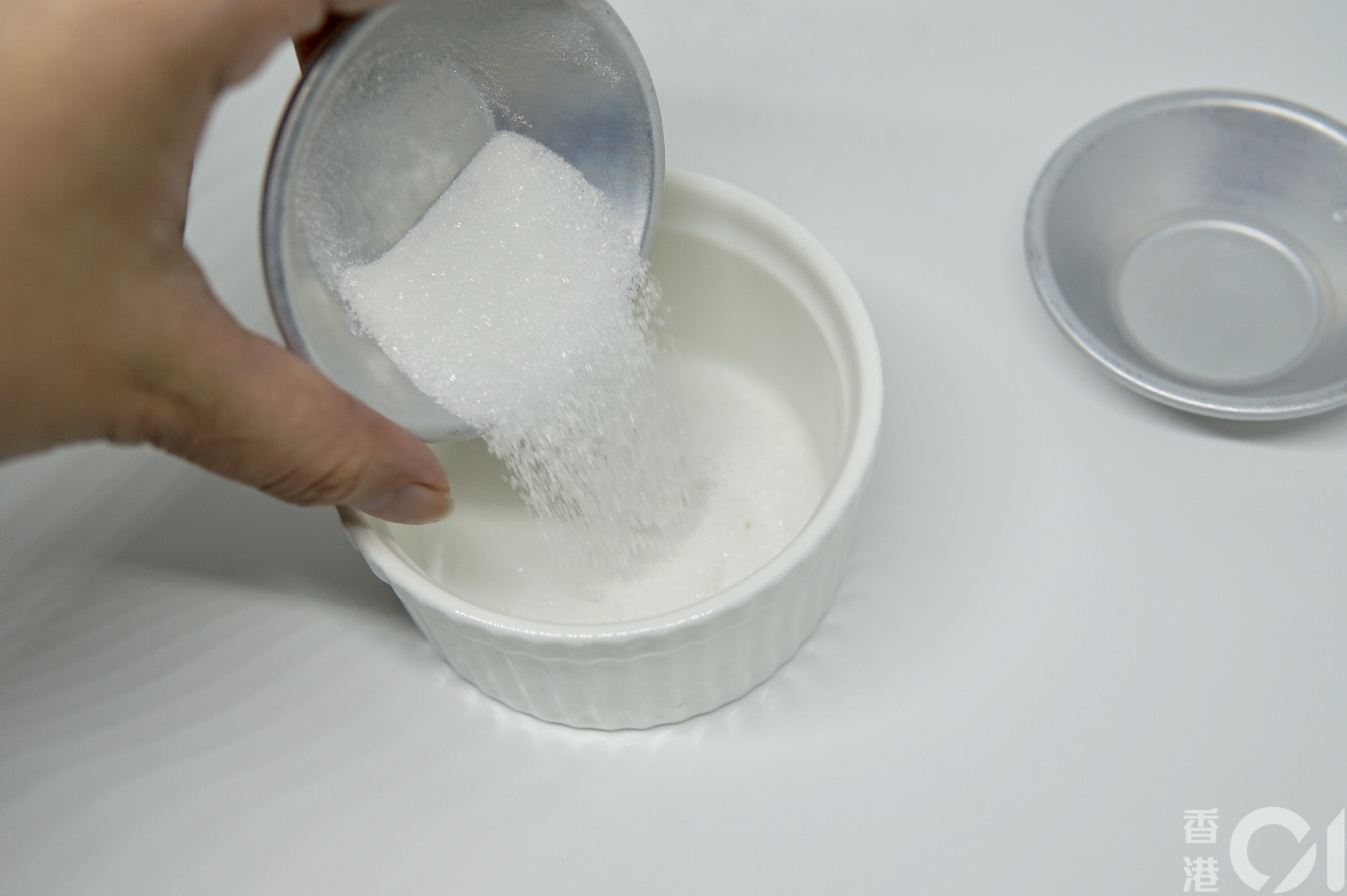 把1湯匙糖倒入容器,盡量鋪平。