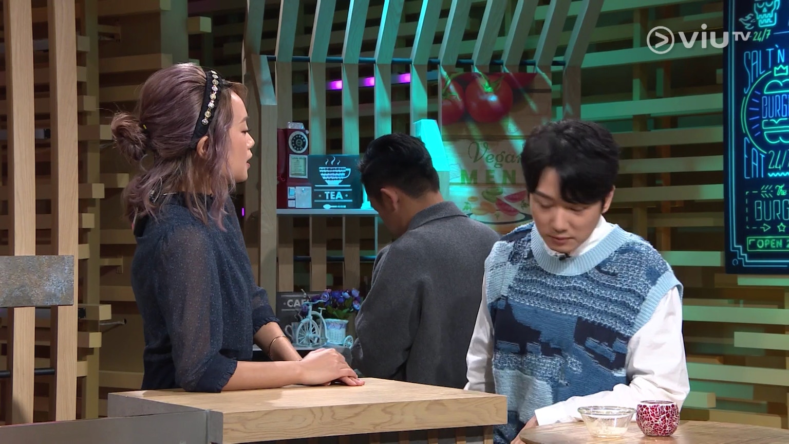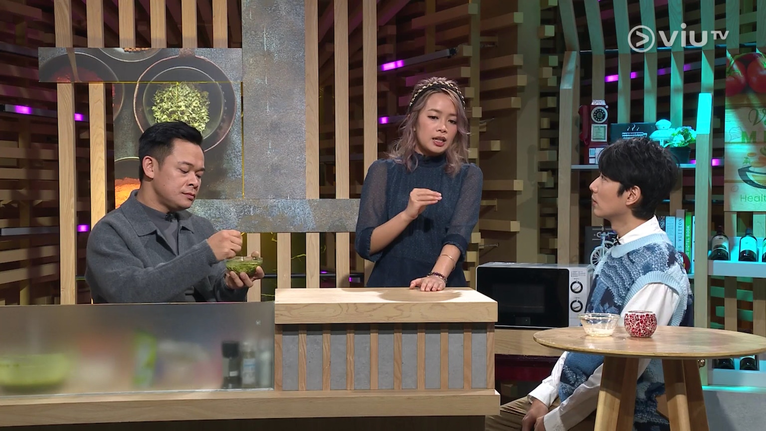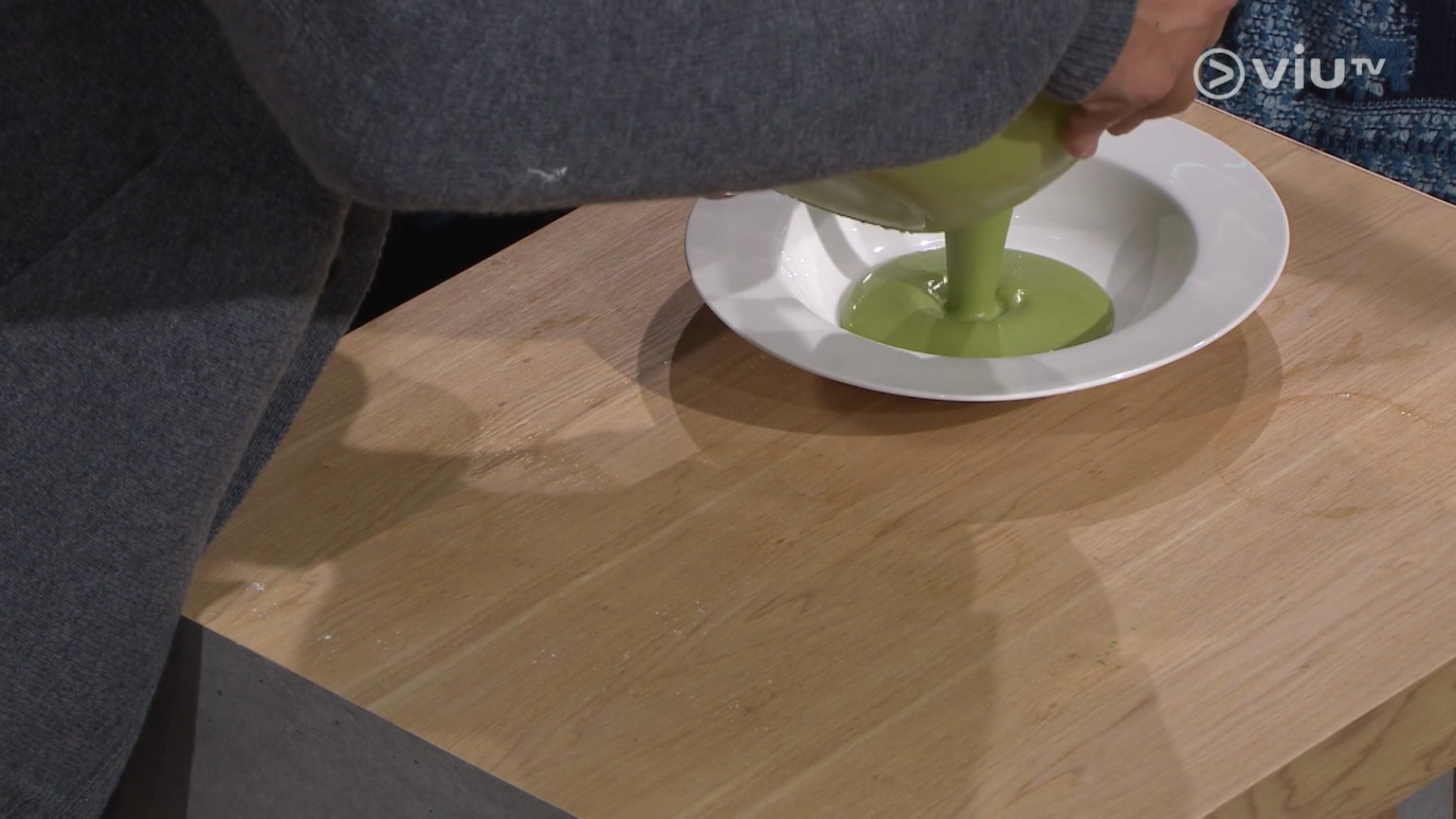 等待期間,梁祖堯似乎在做些甚麼,原來是製作抹茶醬,材料是煉奶與抹茶粉,但這並非必須。(ViuTV《晚吹 - 空肚講宵夜》節目截圖)