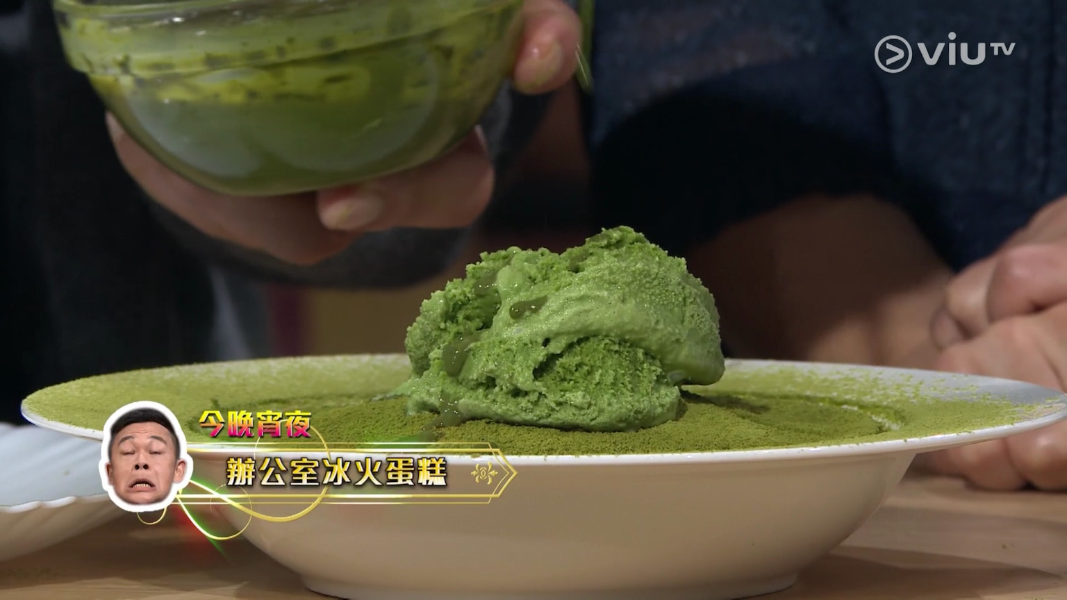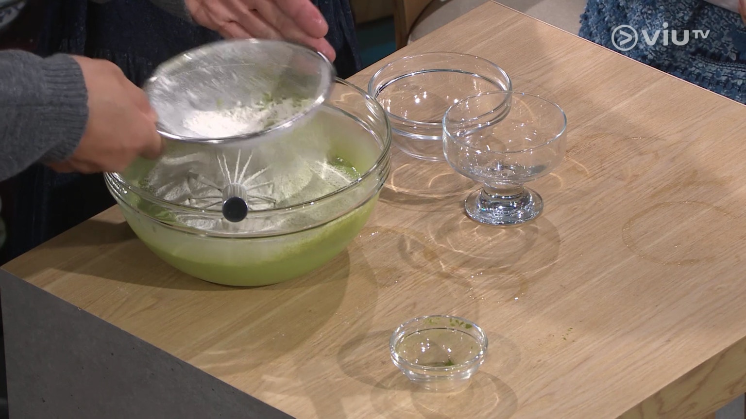 將抹茶粉過篩灑在蛋糕上。(ViuTV《晚吹 - 空肚講宵夜》節目截圖)