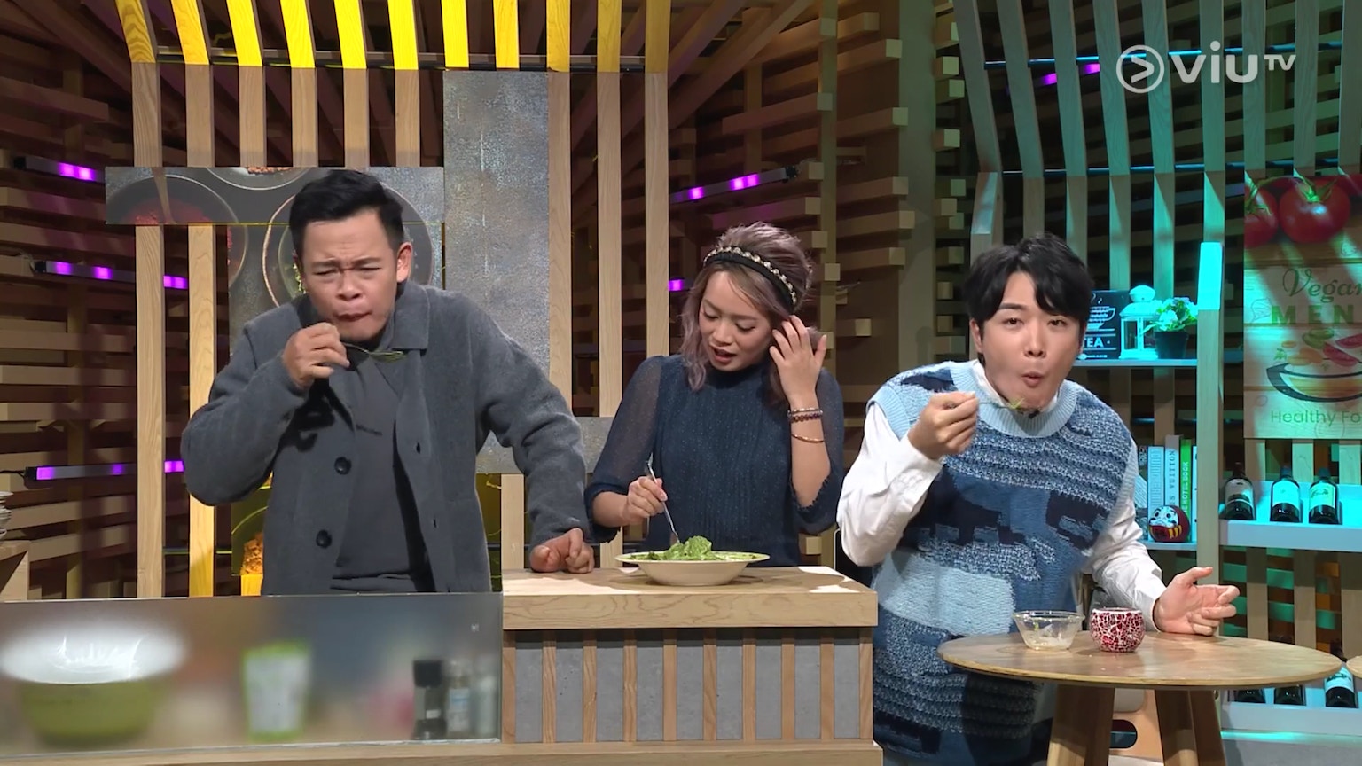 梁祖堯與BabyJohn試食冰火蛋糕的樣子,也蠻搞笑。(ViuTV《晚吹 - 空肚講宵夜》節目截圖)
