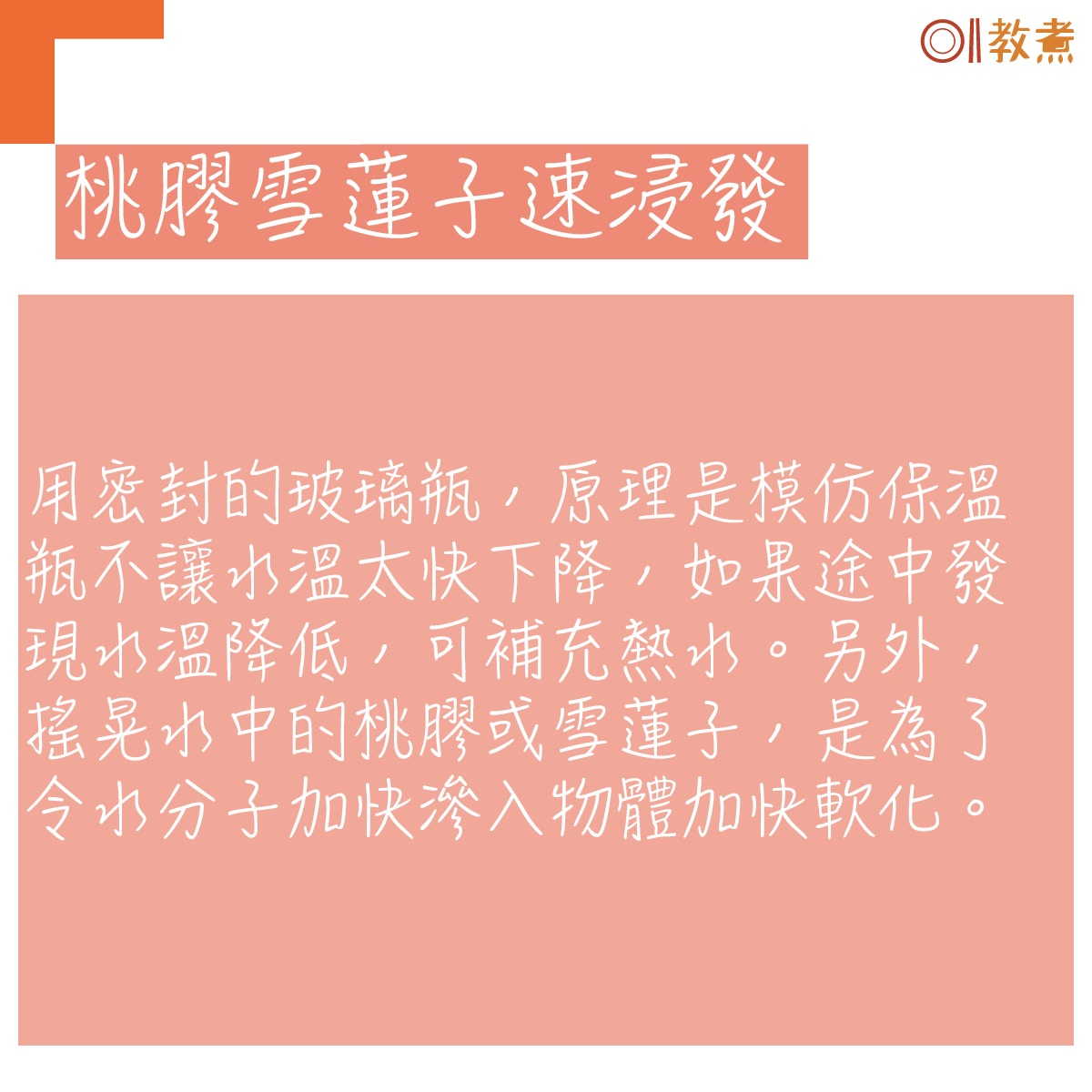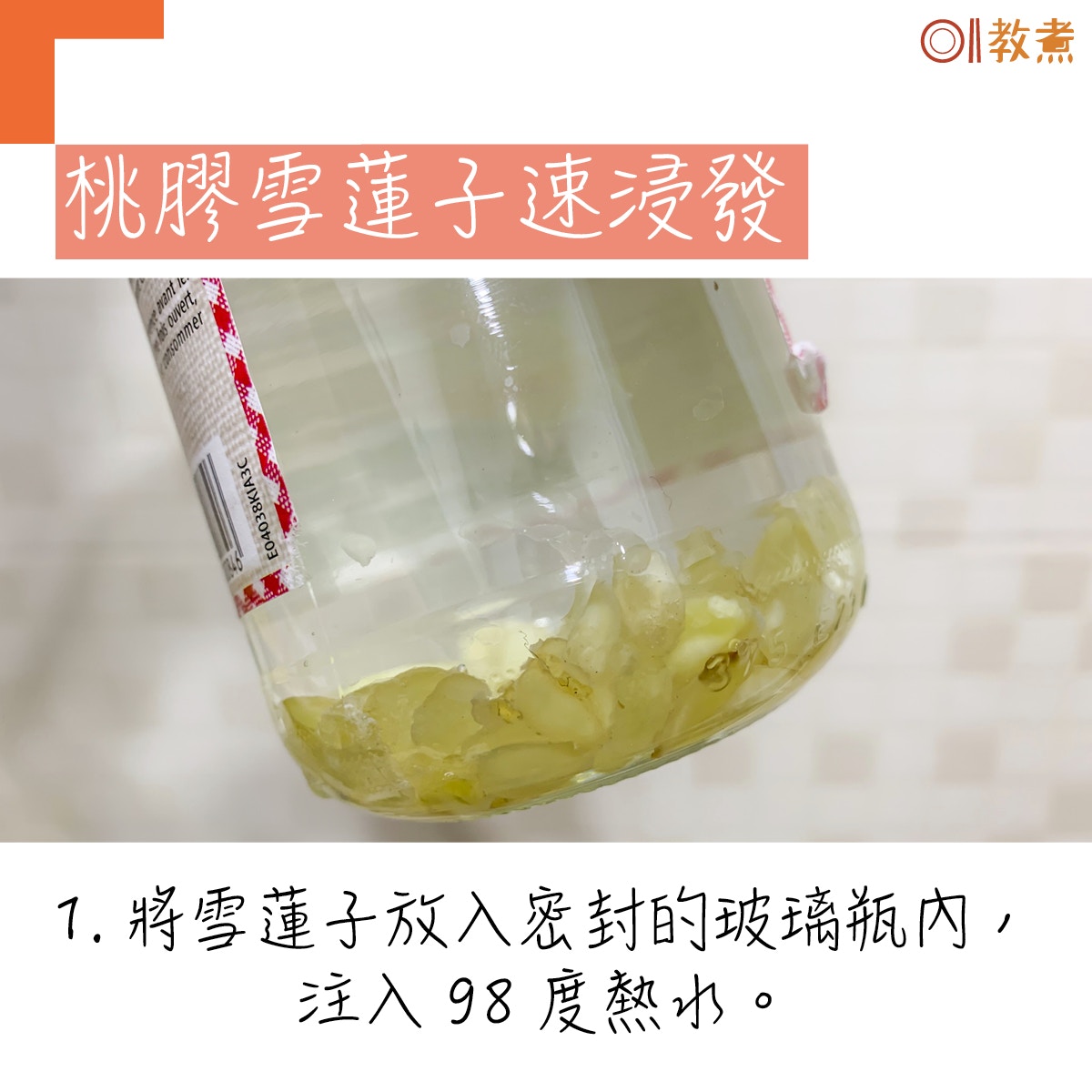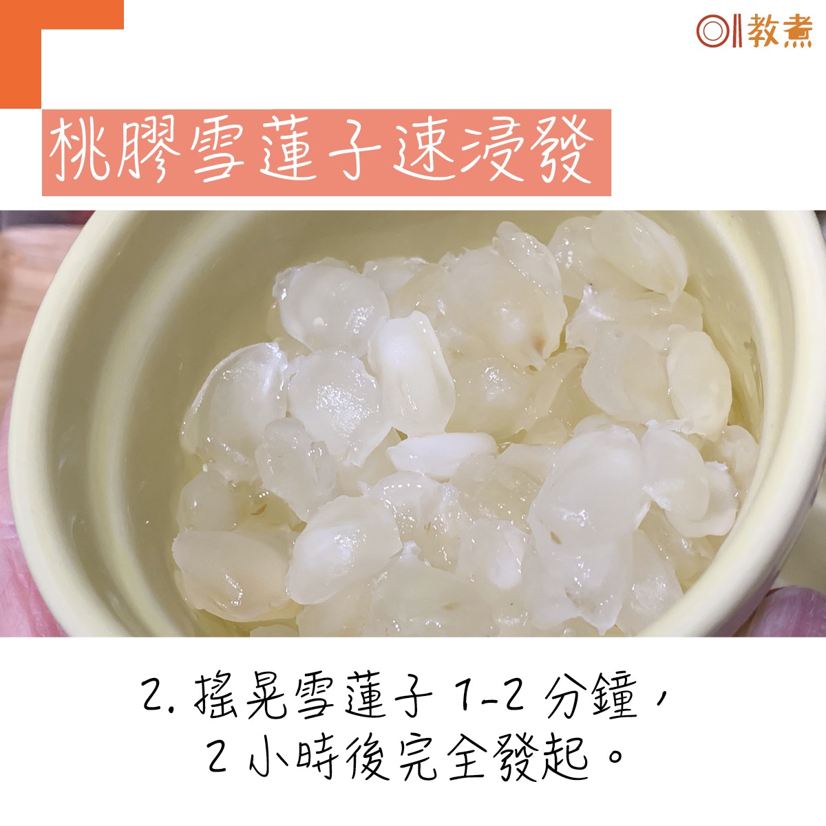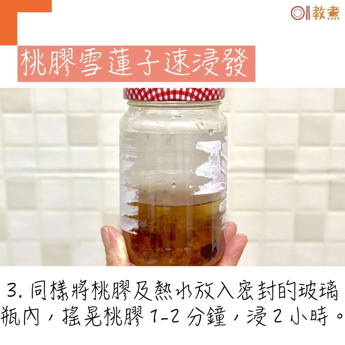 平時等桃膠及雪蓮子浸發,至少用上一晚的時間或大概6至8小時,對於心急或怕麻煩的人來說,這些等候時間太費時。用熱水(暖水)加搖晃法浸泡,只需2小時已將桃膠及雪蓮子發好。