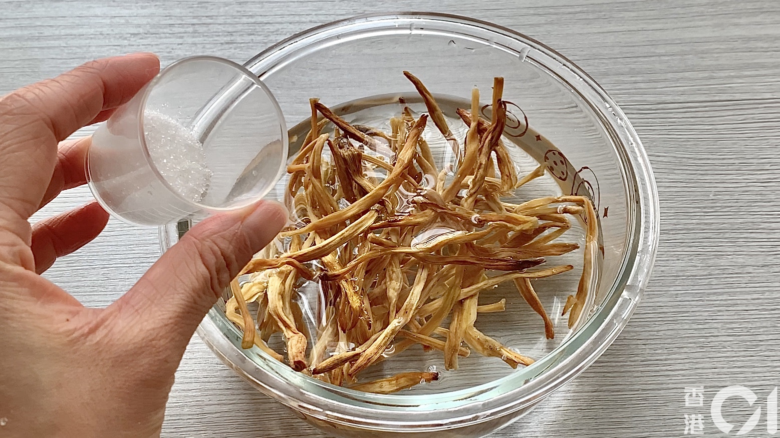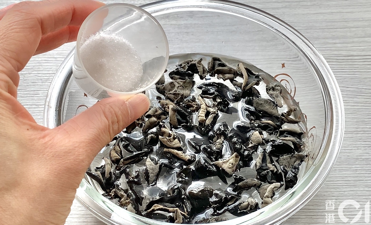Step 2:加入1/2茶匙糖。原理︰白糖可加速雲耳吸收水分。