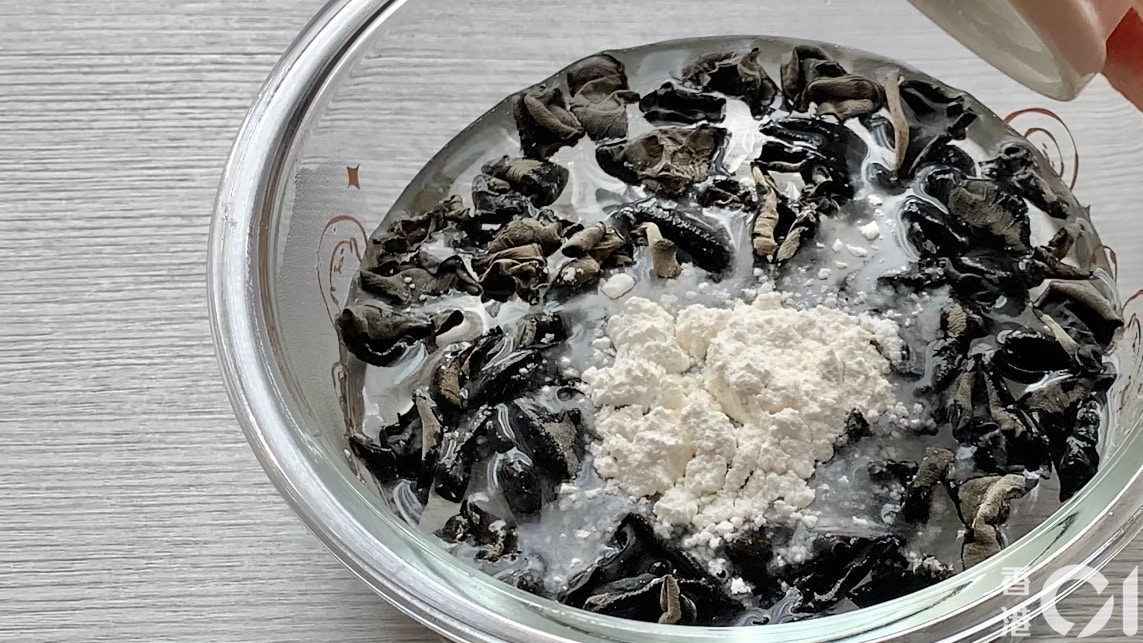 Step 3:加入2茶匙麵粉。原理︰麵粉可吸附雲耳中的污垢及雜質,令泡完的雲耳更乾淨。