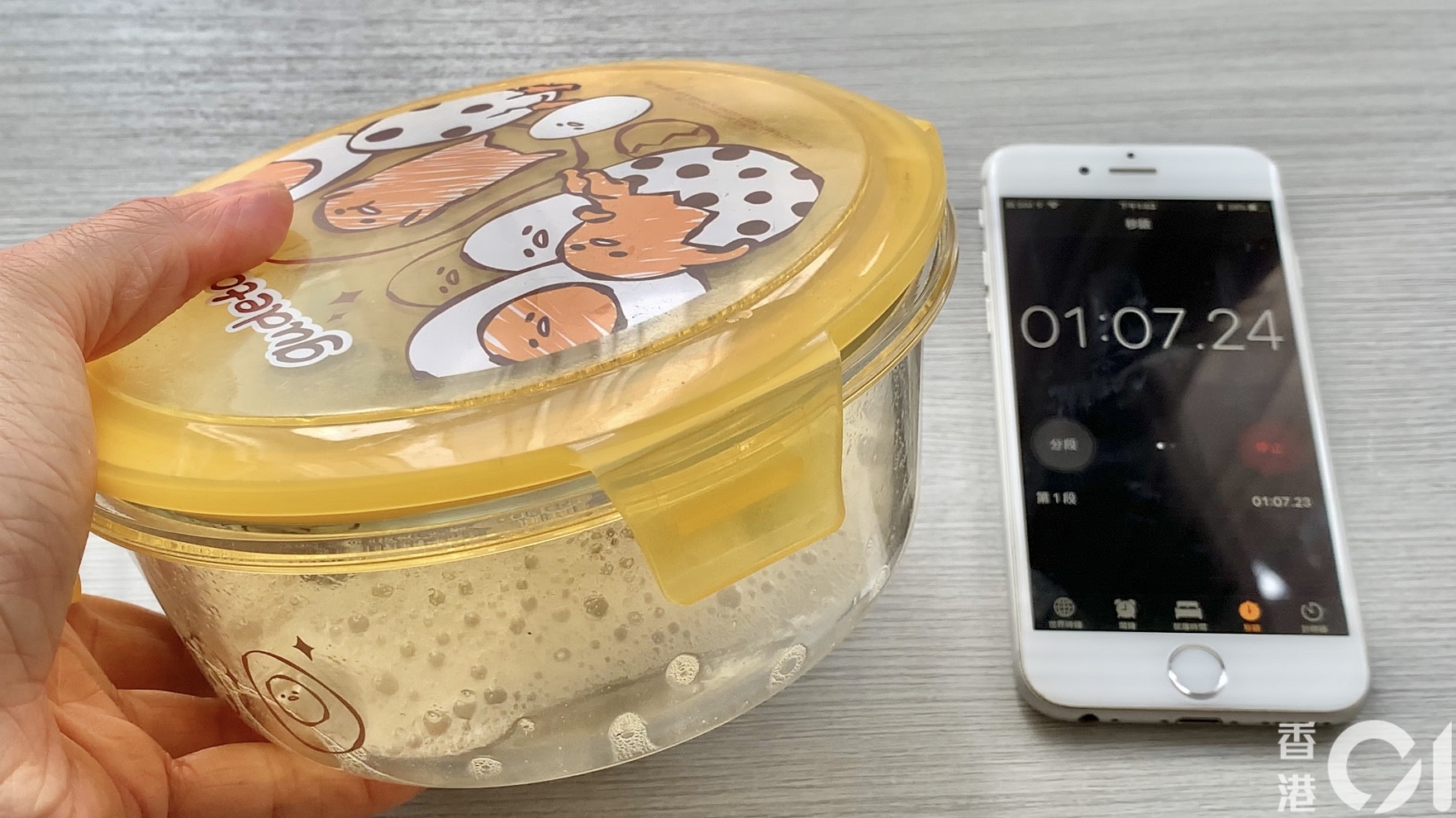 開始搖晃食物盒。原理︰快速搖晃為了加速水分子的運動令金針快速吸收水分。