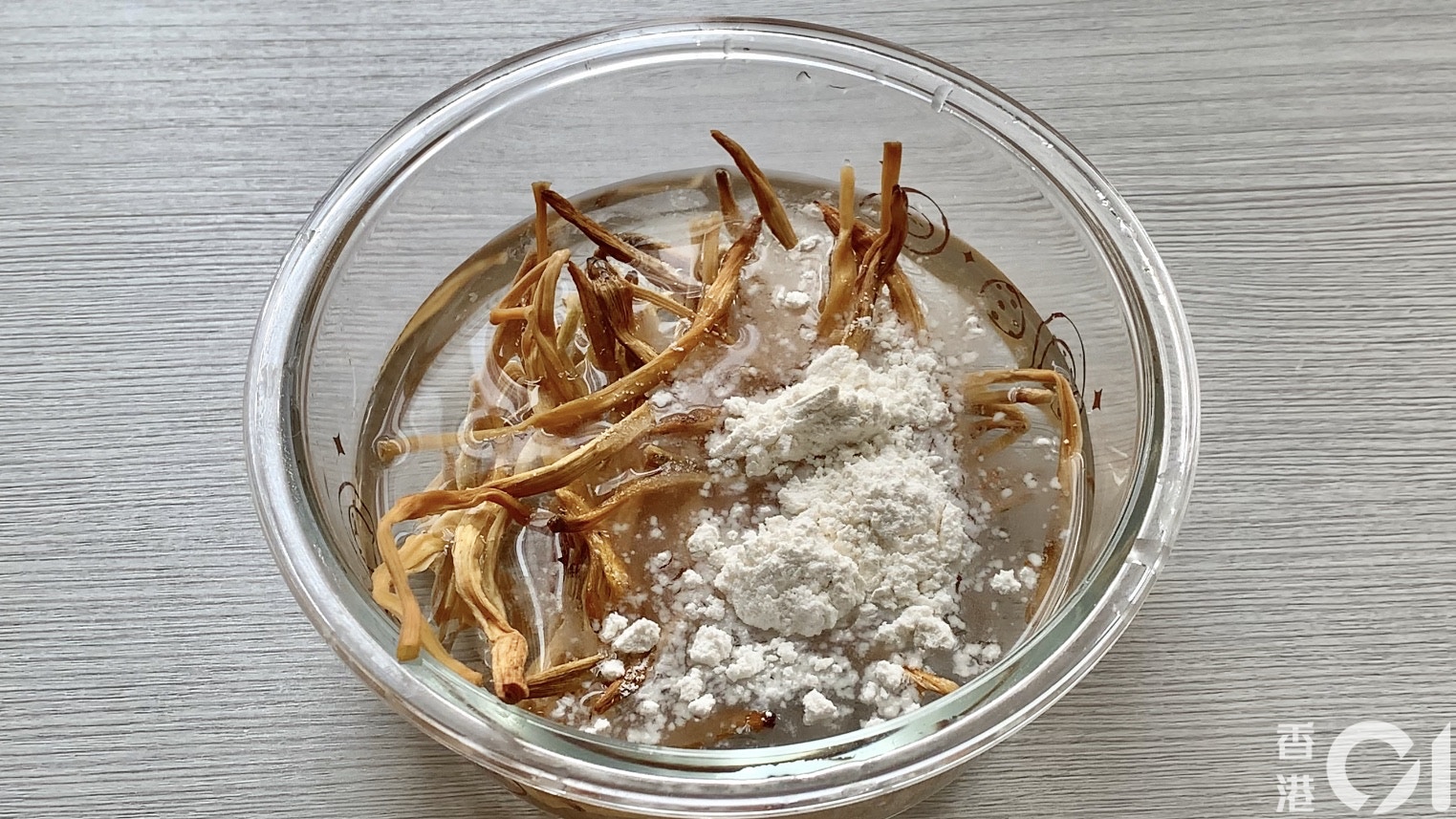 加入2茶匙麵粉。原理︰麵粉可吸附金針中的污垢。