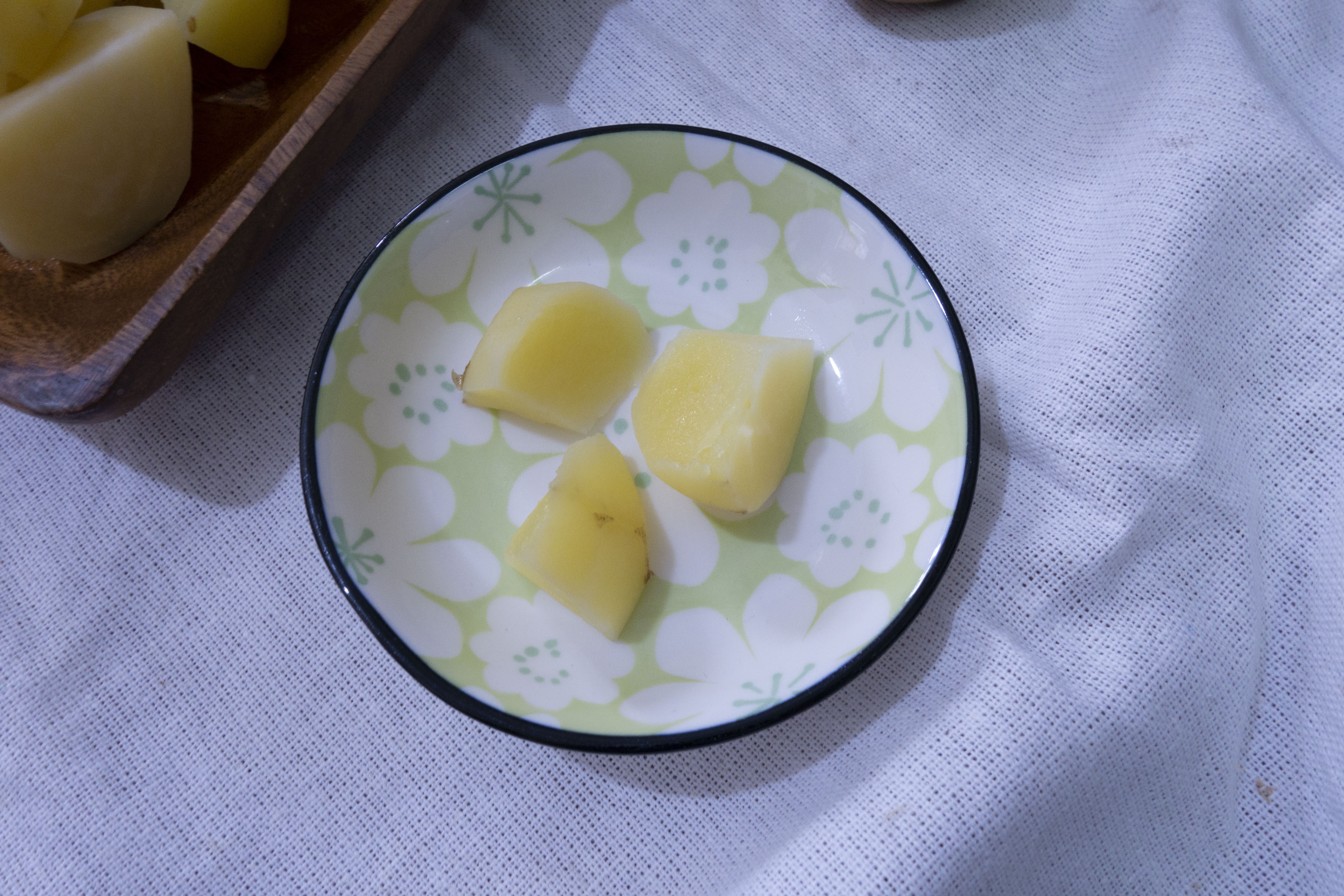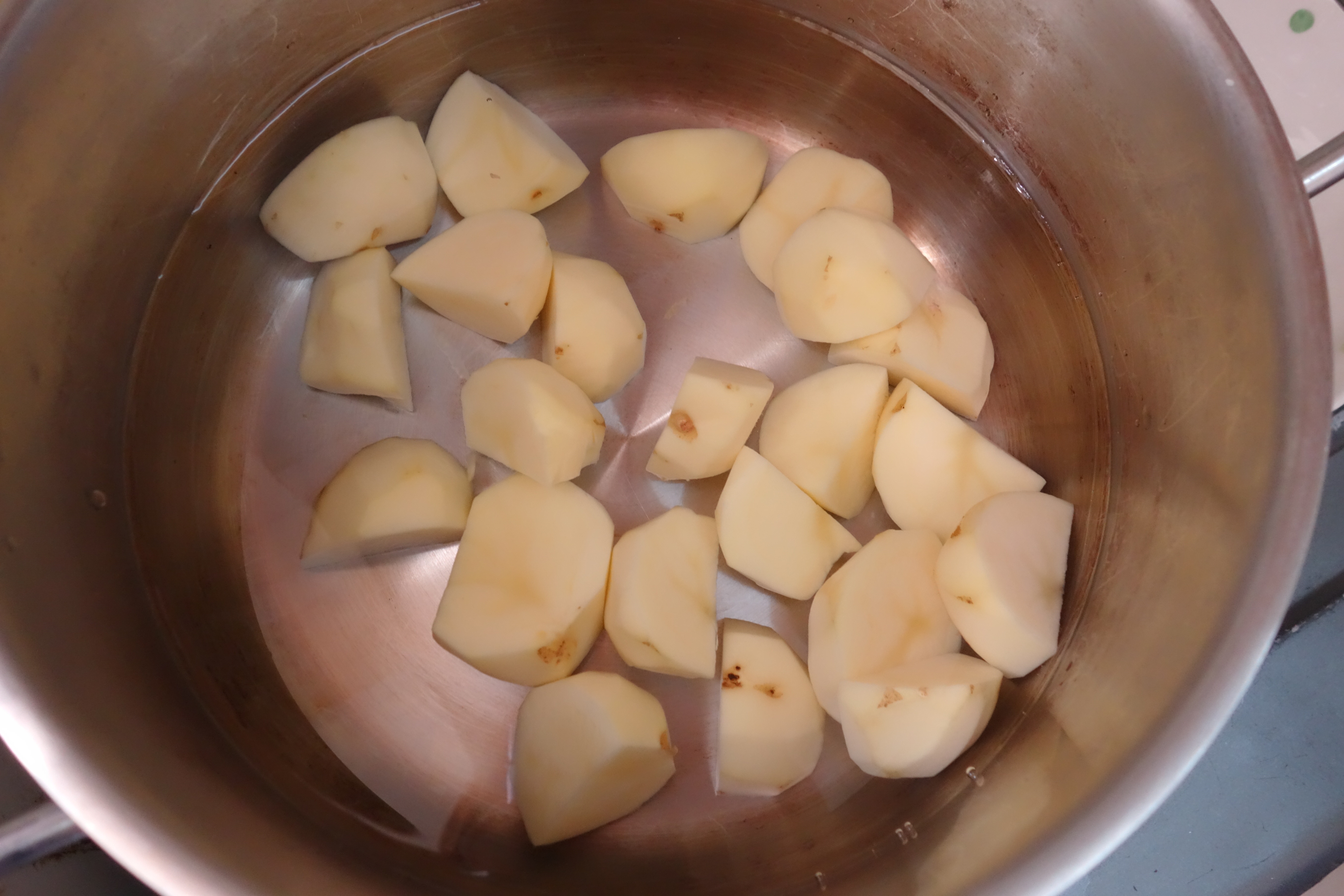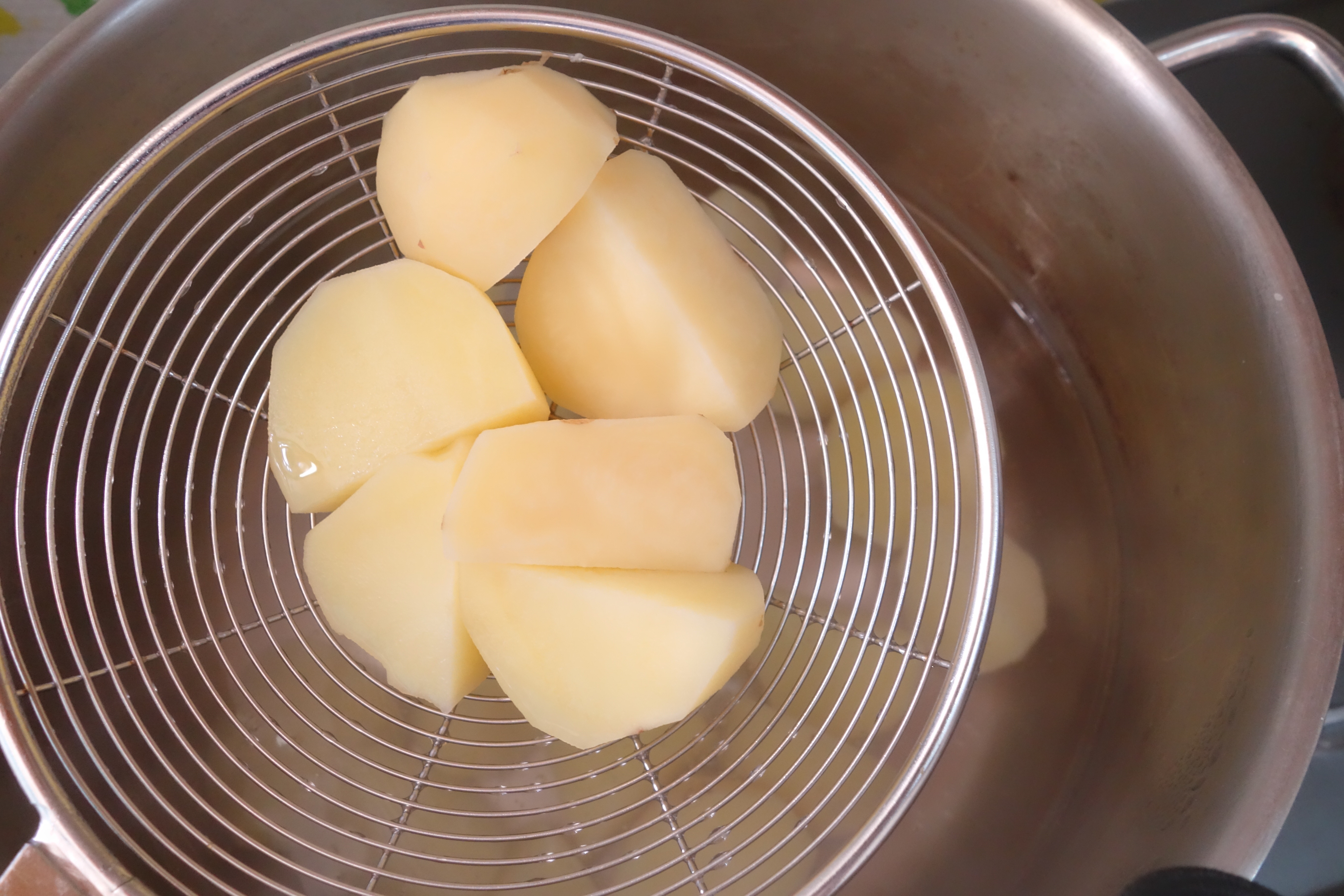 其後去皮,亦可以在薯仔烚好後才去皮。