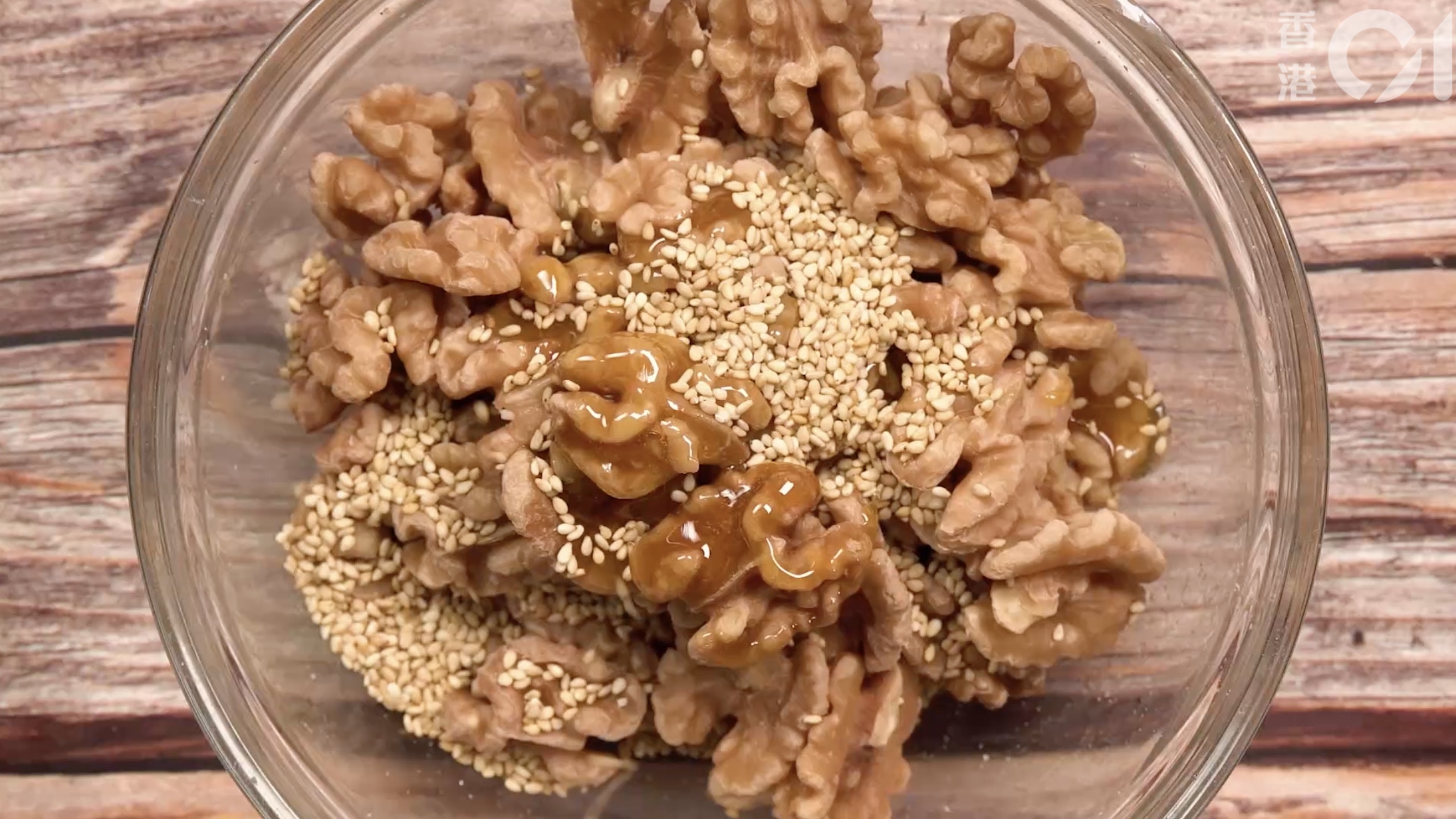 下一步,就是在碗裡一次過將麥芽糖、合桃、芝麻與油拌勻,全程於離火情況下進行,相當安全,亦不會發生煮燶糖、炸燶合桃等狀況,另一好處是不需要另外烘白芝麻,是不是很省工夫呢?