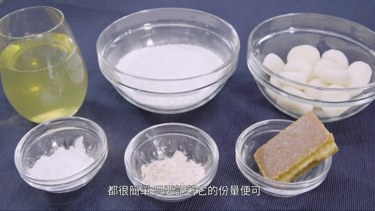 馬蹄糕的所需材料,有菊花茶、馬蹄粉、馬蹄、澄麵、吉士粉和片糖。(節目截圖:《Gi味俱全》)