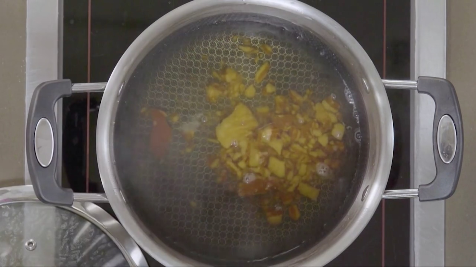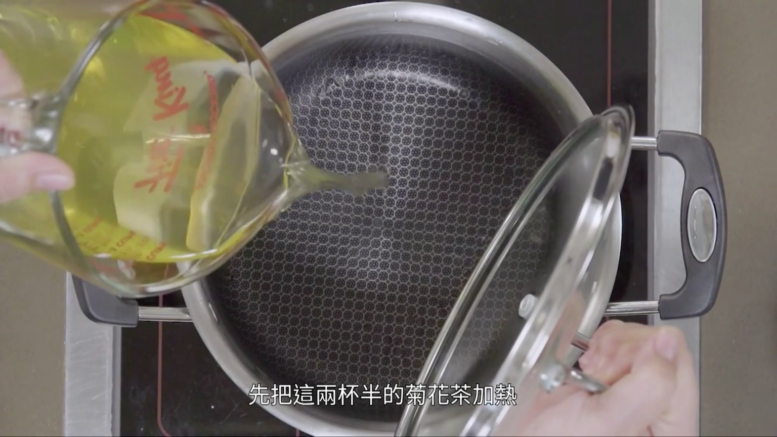 先加熱兩杯半的菊花茶。【小貼士】加熱菊花茶的作用,是為了煮溶片糖。(節目截圖:《Gi味俱全》)