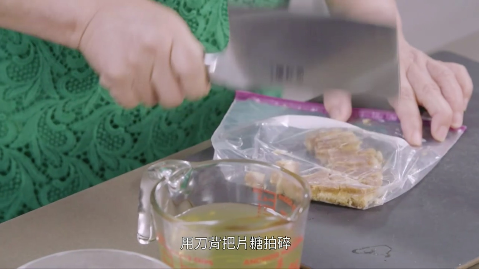 【小貼士】嫌片糖太大塊,可放進密實袋裡,用刀背拍碎,那麼煮起來就會比較快溶。(節目截圖:《Gi味俱全》)