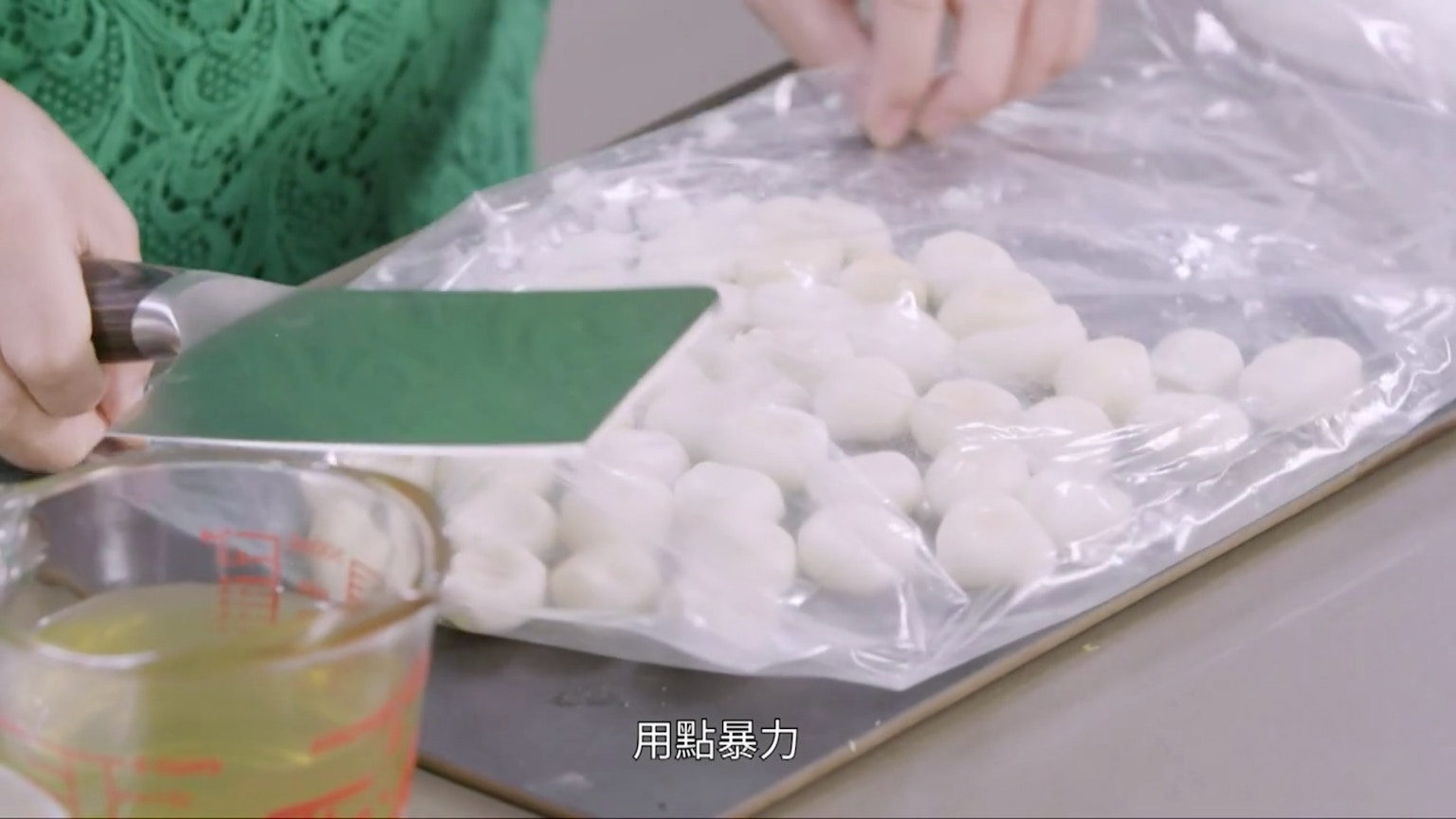 【小貼士】Gigi姐不喜歡太工整的馬蹄,認為會頂到牙齒,所以她不會切粒,而是與片糖採取同一做法,放進密實袋再用刀把它拍碎。(節目截圖:《Gi味俱全》)