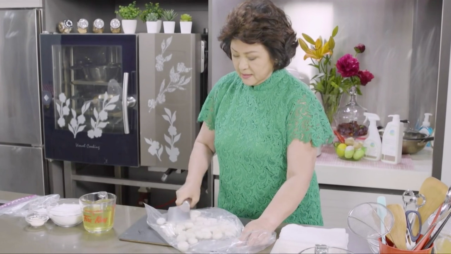 除了年糕之外,清新的馬蹄糕一樣有很多捧場客,而為了讓大家在新年吃滯了的時候可以清清熱,她還示範了菊花味的馬蹄糕。