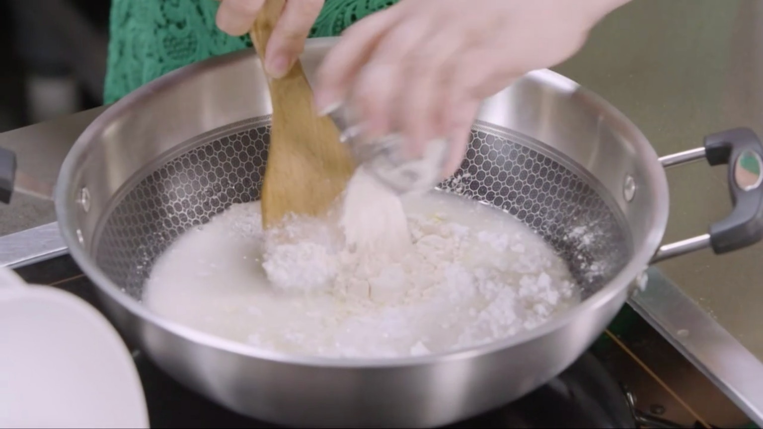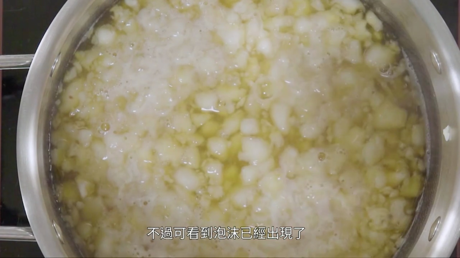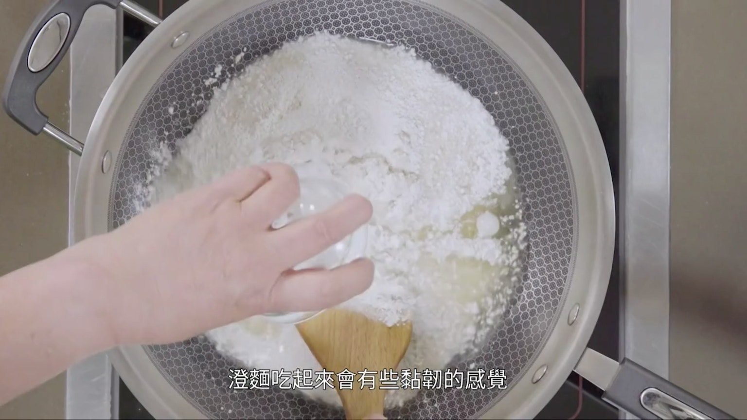 此時可以開火,把鍋中粉糊加熱,當它變稠和成型時,會呈半透明顏色。(節目截圖:《Gi味俱全》)