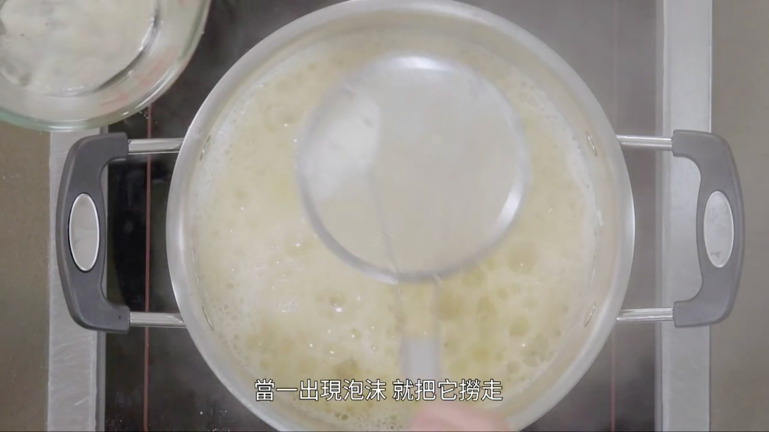 此時,可將泡沫撈走,馬蹄菊花糖水放涼。(節目截圖:《Gi味俱全》)