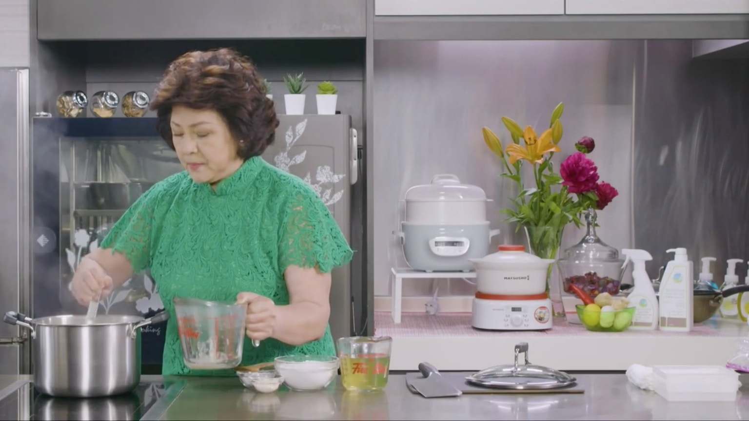 下一步可將馬蹄加到菊花糖水中。【小貼士】火太猛會蒸乾菊花茶、影響整體分量,所以一水滾,見到片糖已溶就可以把馬蹄碎加進去。(節目截圖:《Gi味俱全》)