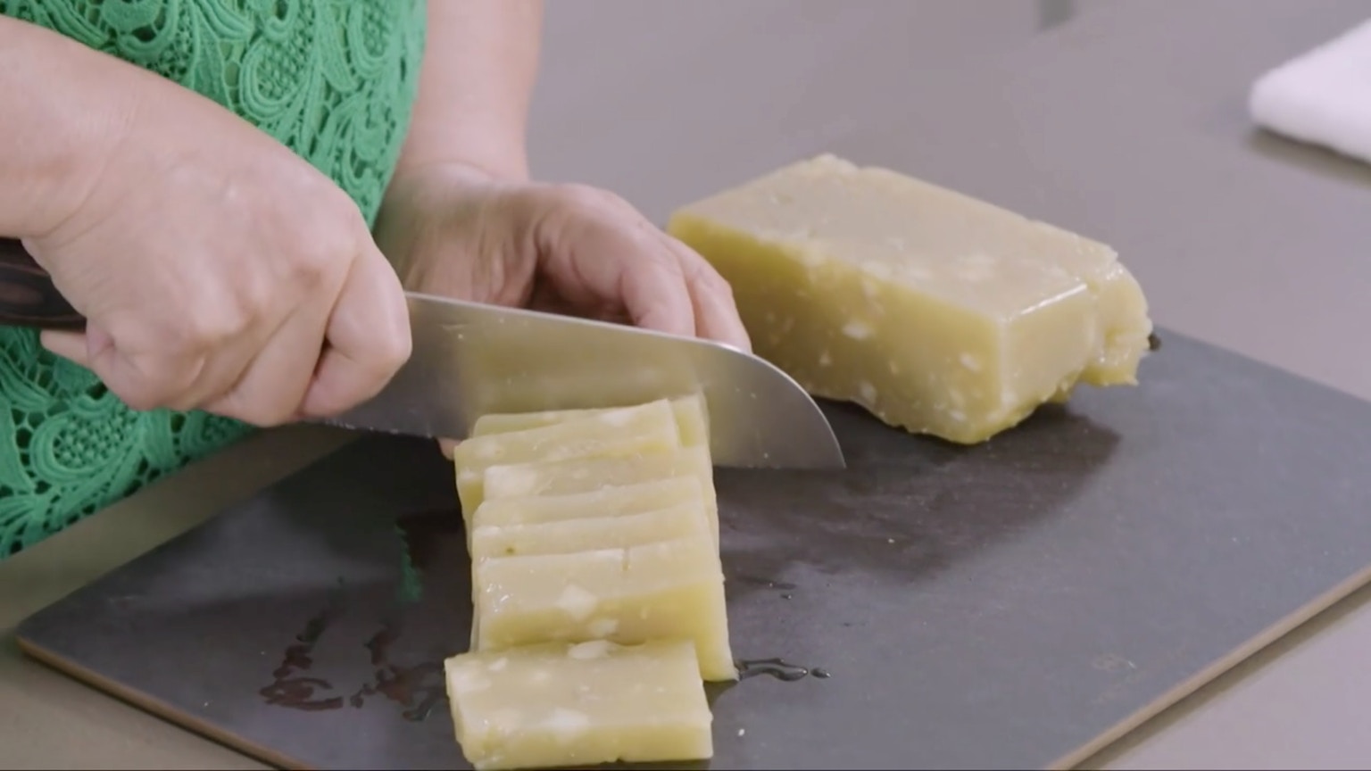 把馬蹄糕切成一件件。(節目截圖:《Gi味俱全》)