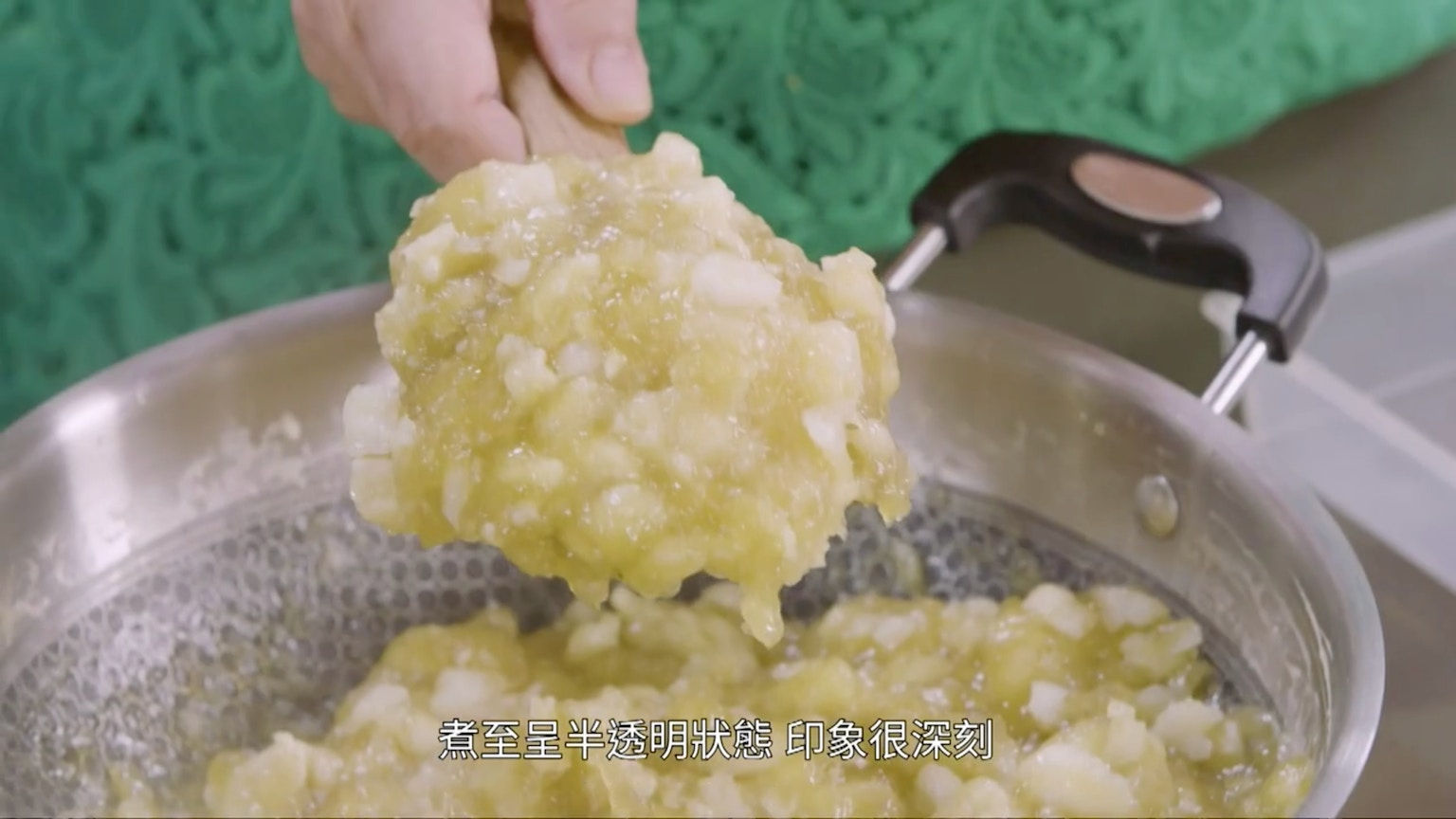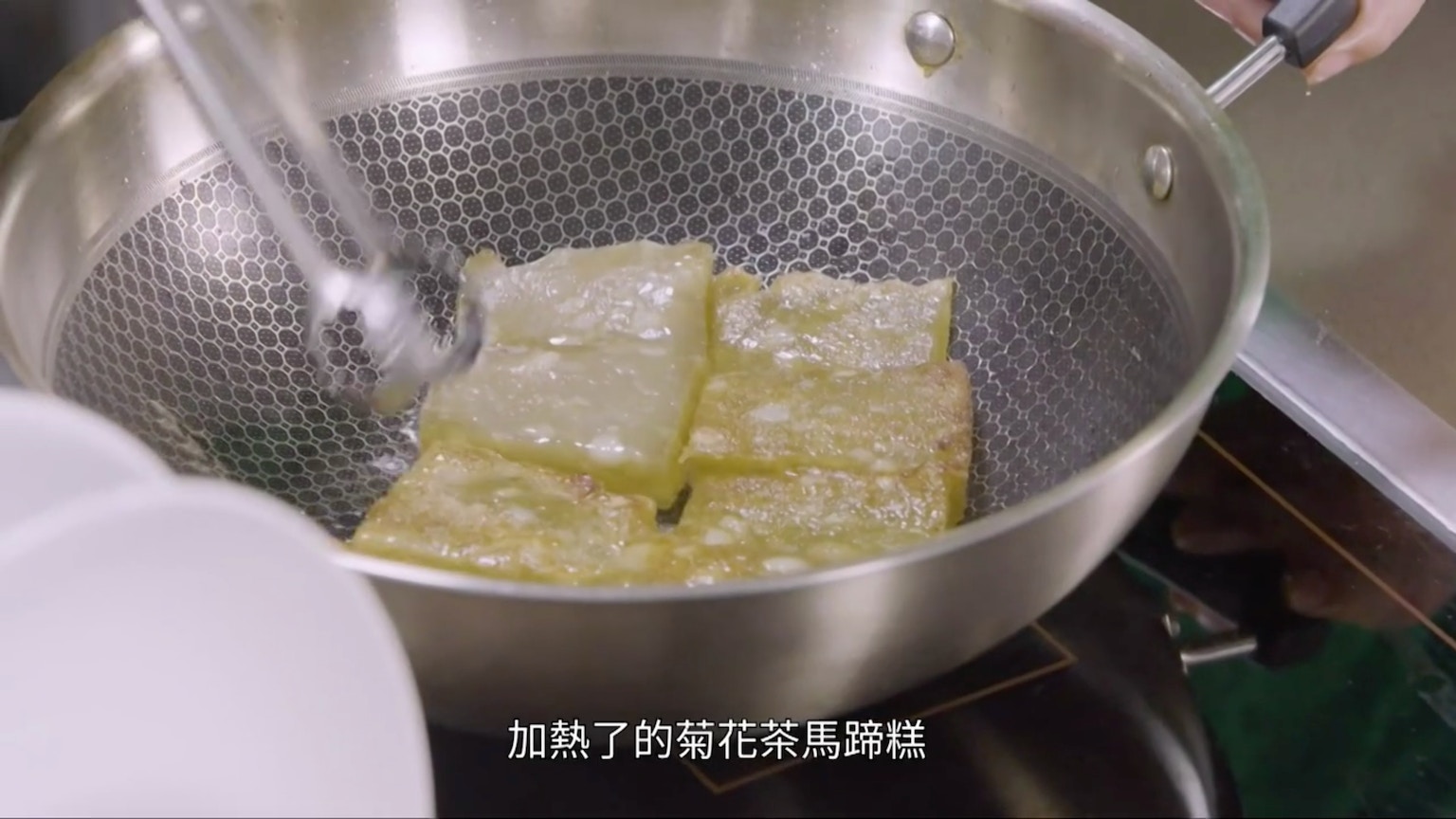 記緊要持續攪拌,直至鍋中的馬蹄漿變成半透明為止,便差不多能入模。(節目截圖:《Gi味俱全》)