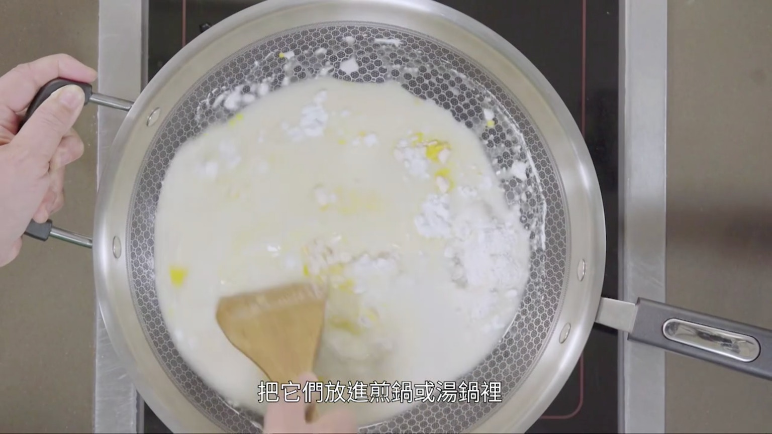 將以上材料放在鍋中,攪拌成幼滑狀。(節目截圖:《Gi味俱全》)