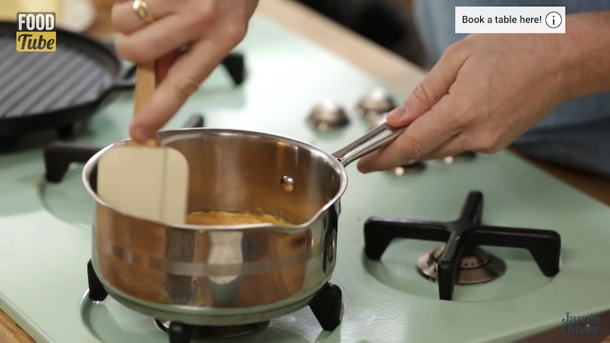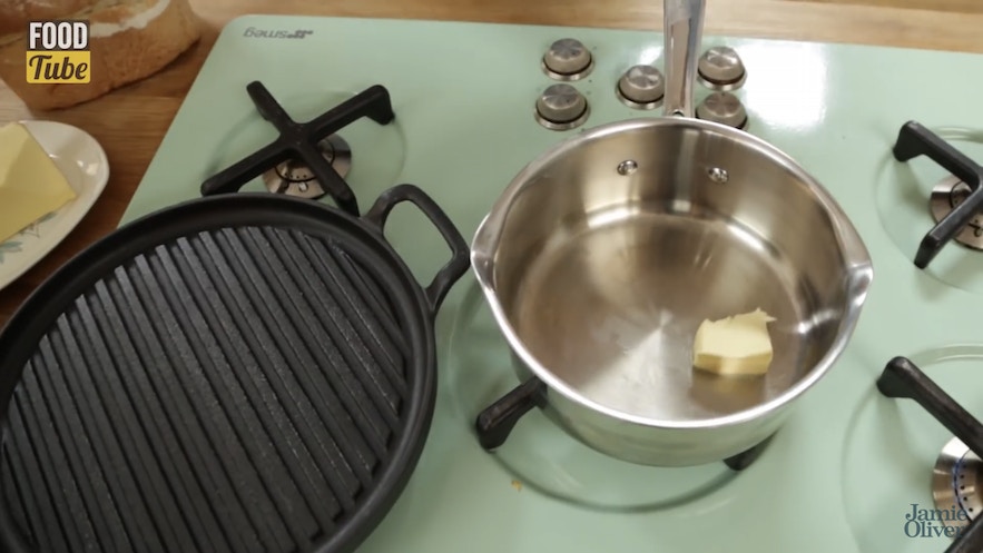【英式炒蛋】鑊燒熱,將一塊牛油落鑊。(影片截圖:Jamie Oliver)