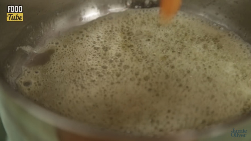 【英式炒蛋】牛油煮至冒泡後,便可將蛋液注入,以中火炒蛋。(影片截圖:Jamie Oliver)