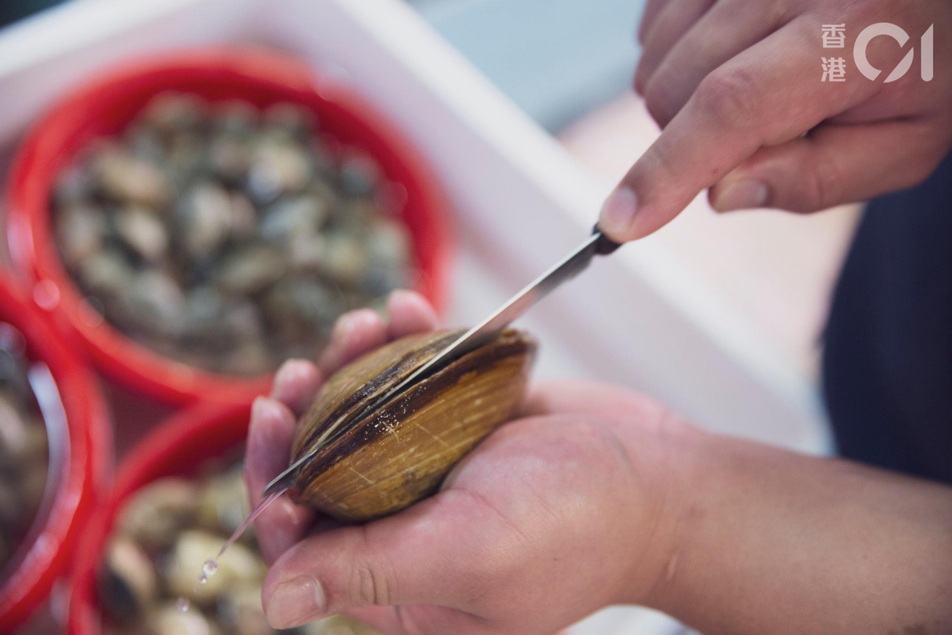 蚌殼之間的縫隙有一條裙邊,若然蚌夠生猛,把它切開時應感受到刀被啜住的感覺。(資料圖片/龔嘉盛攝)
