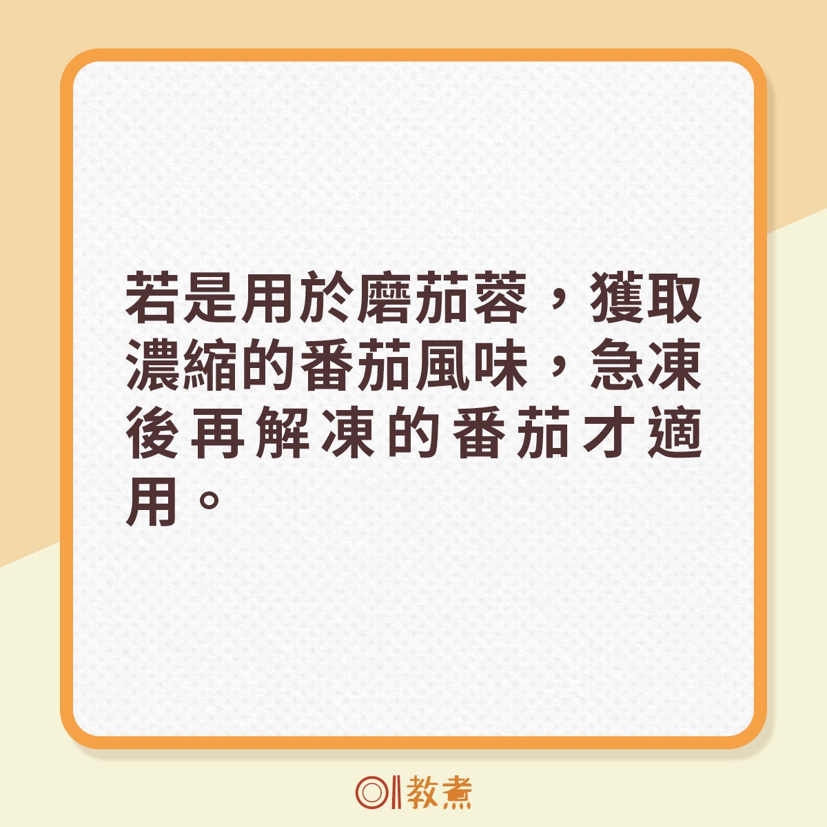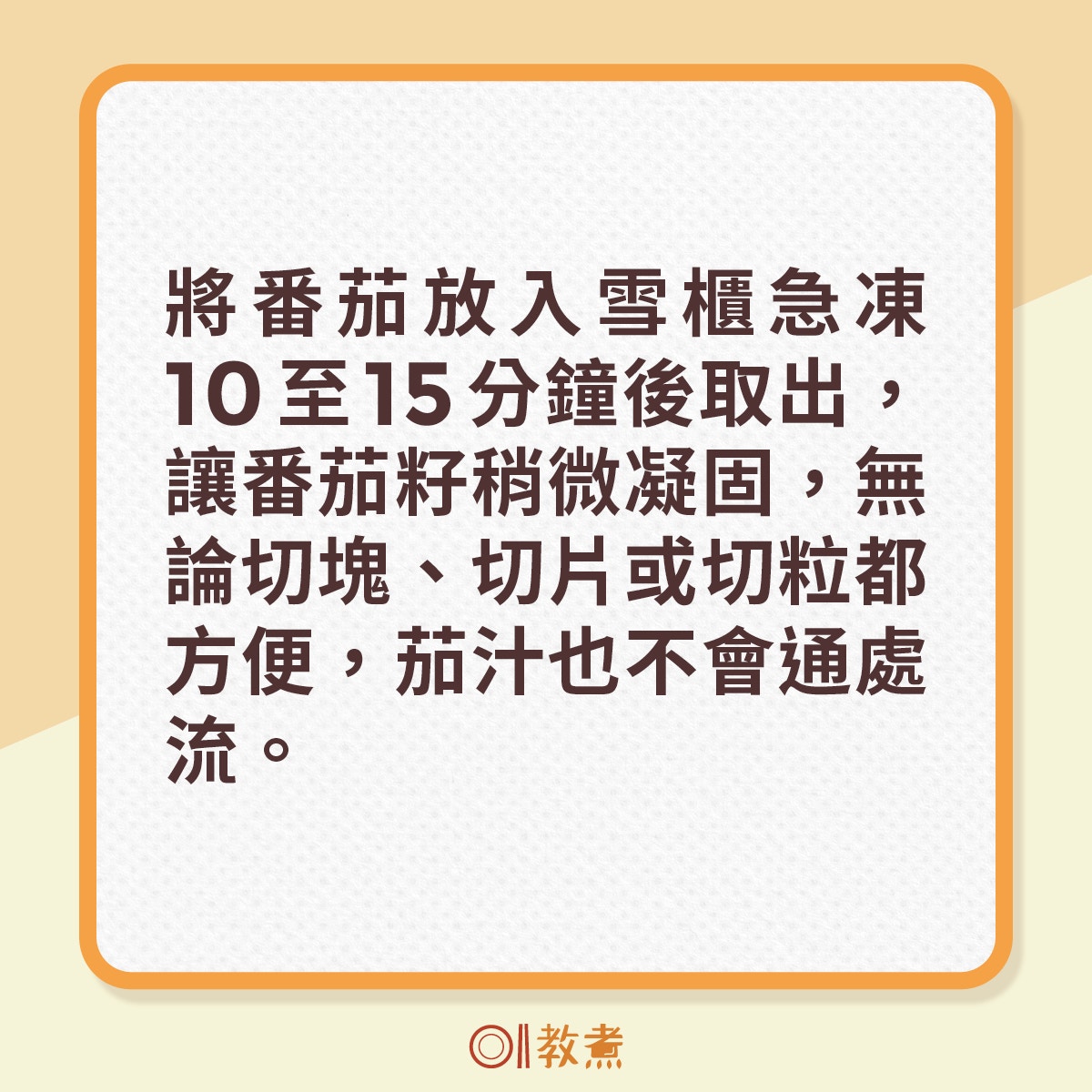 將番茄放入雪櫃急凍10至15分鐘後取出,讓番茄籽稍微凝固,無論切塊、切片或切粒都方便,茄汁也不會通處流。急凍的時間不要過久,否則急凍再解凍,番茄的口感會變得軟爛。若是用於磨茄蓉,獲取濃縮的番茄風味,急凍後再解凍的番茄最適合。