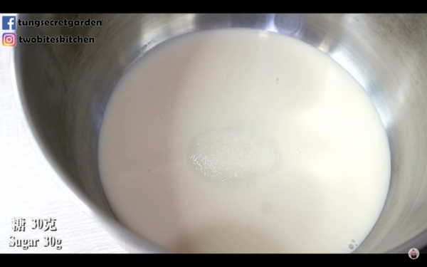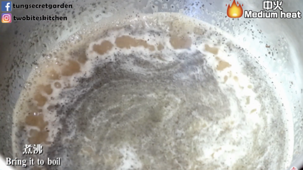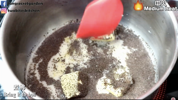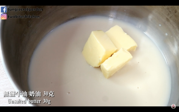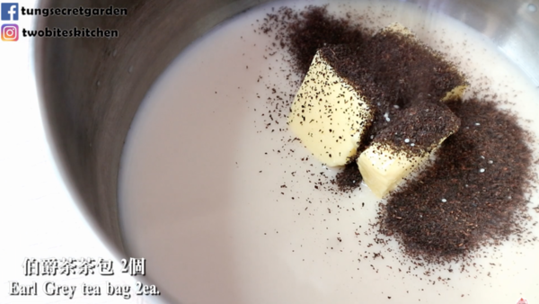 1. 把牛奶/豆漿、糖、牛油、伯爵茶葉放入鍋,以中火加熱煮沸