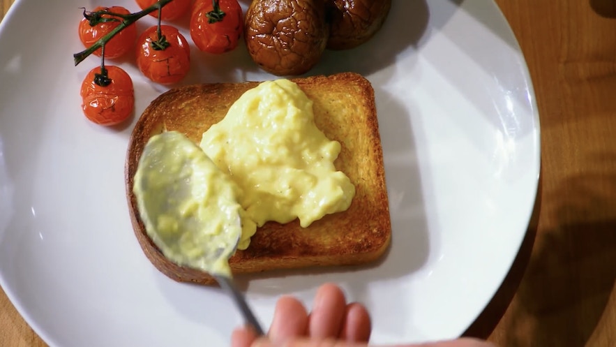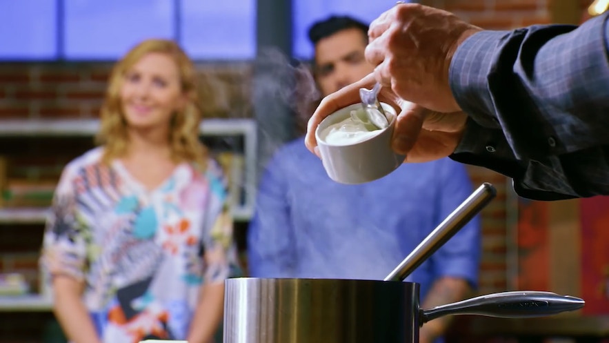 【小貼士】此外,可加1茶匙法式酸忌廉調味,讓炒蛋更幼滑,亦可防止雞蛋過老。(影片截圖:MasterChef On FOX)