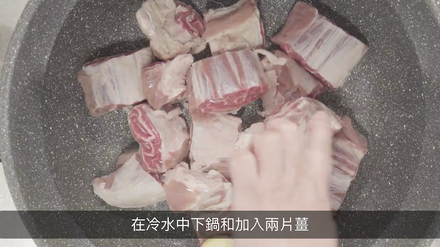 她示範將牛腱飛水,先凍水下肉,並習慣加兩片薑,辟走肉的腥臊味。(節目截圖:《Gi味俱全》)