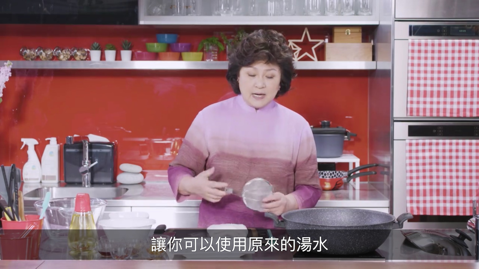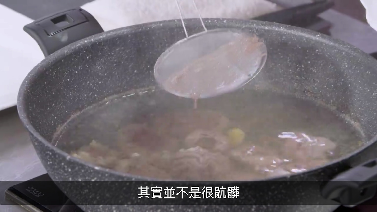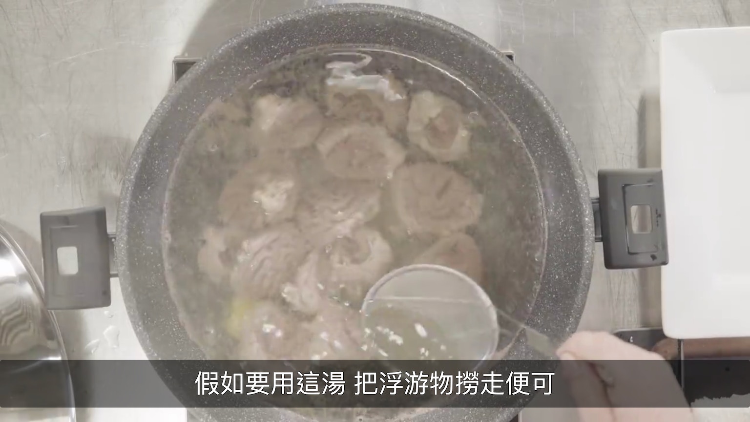 她指其實這鍋湯真的不算太髒,你可以用湯碗裝少許水,撇完一下就把網篩浸在那碗水,即輕鬆洗走浮沫。(節目截圖:《Gi味俱全》)
