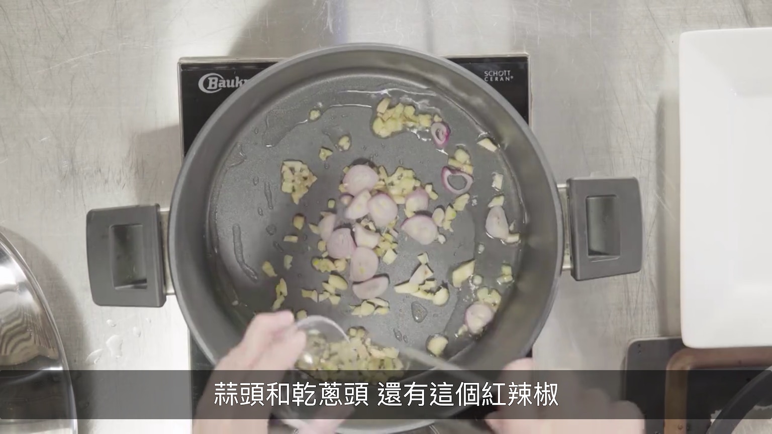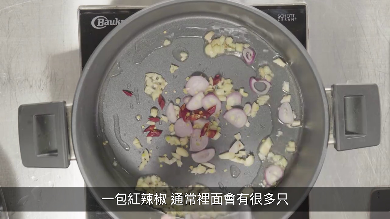 鑊燒熱下油,大火爆香薑、蒜、乾葱頭與辣椒。(節目截圖:《Gi味俱全》)