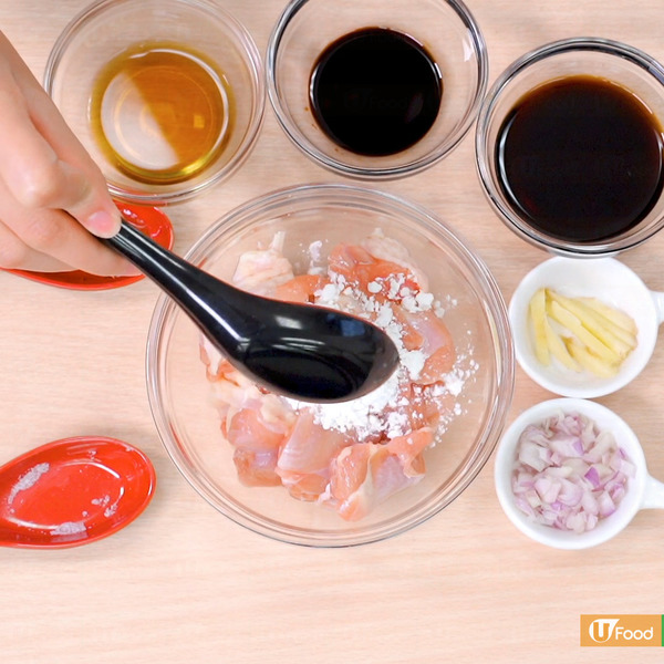 2. 雞髀肉切件後,加入生抽、老抽、麻油、紹酒、砂糖,醃製最少15分鐘