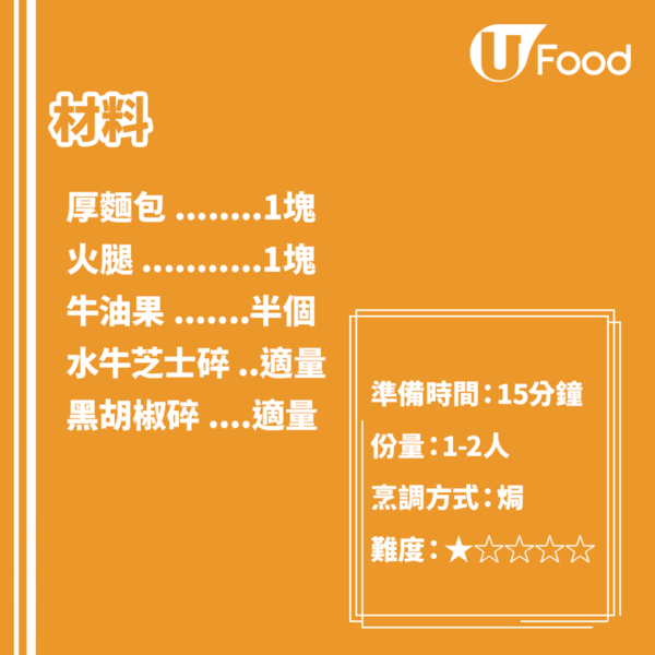 芝士火腿三文治就見得多,加入牛油果片,放上多士同樣好食,喜歡的話也可以改用法國麵包或者牛角包,份量少少,簡單快速做好,當作早餐、下午茶一流。