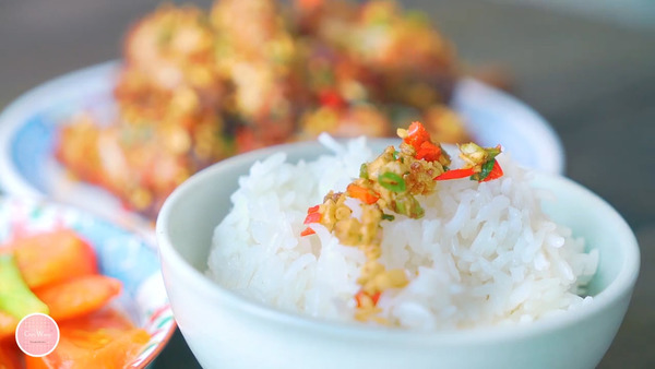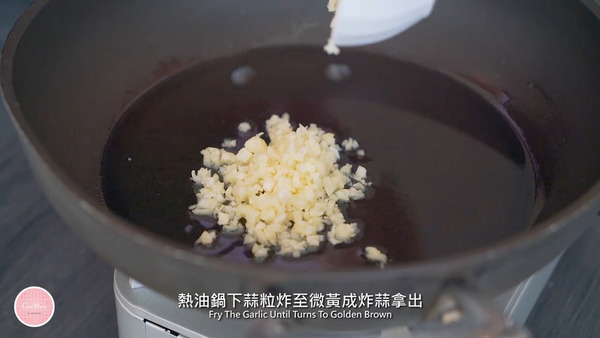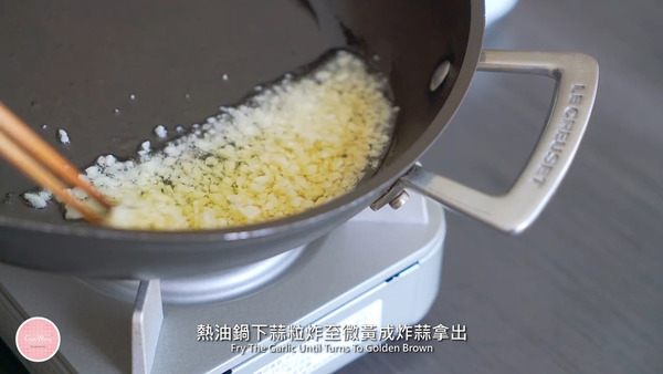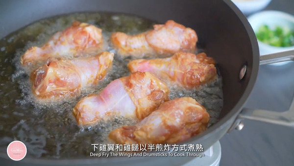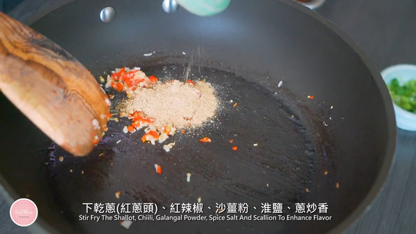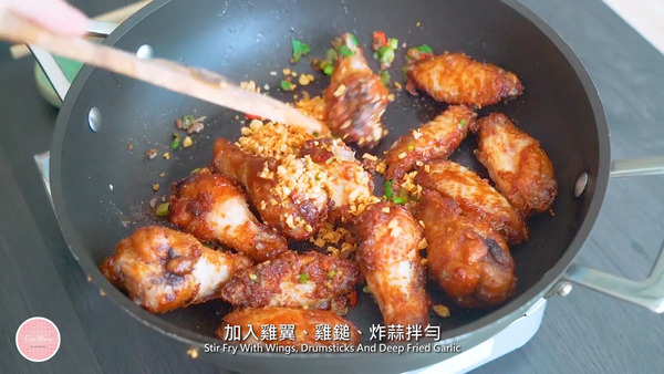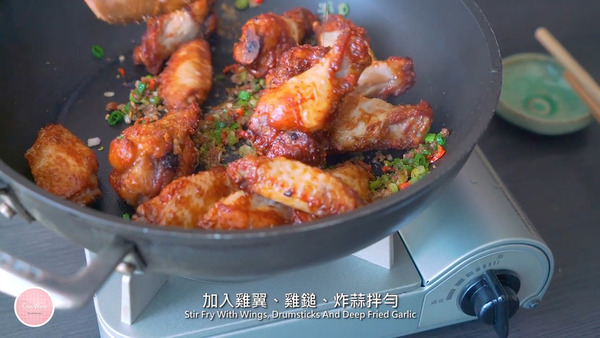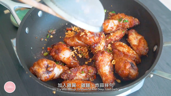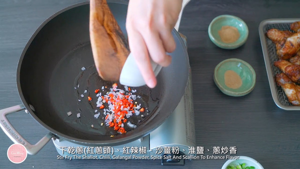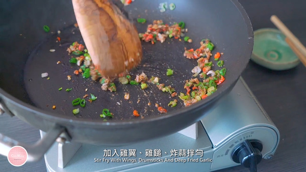 4. 熱油鍋下蒜粒炸至微黃成炸蒜拿出,然後下乾蔥 (紅蔥頭)、紅辣椒、蔥、沙薑粉、淮鹽炒香,加入雞翼、雞鎚、炸蒜拌勻便可