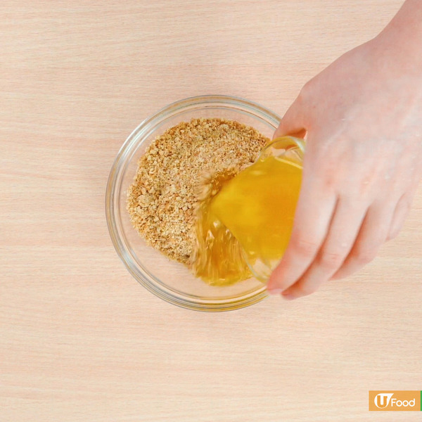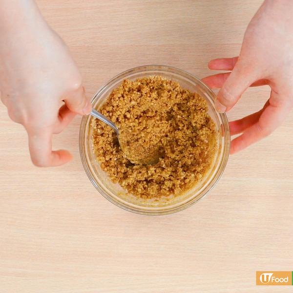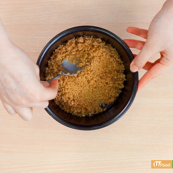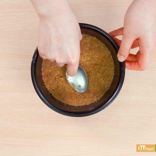 1. 壓碎消化餅,加入牛油溶液拌勻,在蛋糕模內壓成餅底,放入雪櫃裏冷藏約20分鐘。