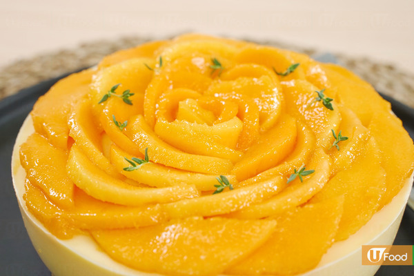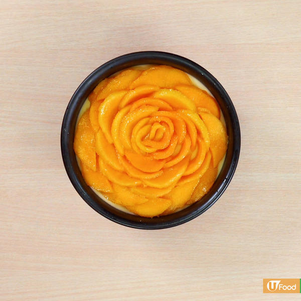 3. 芒果起肉切片,蛋糕面上排成玫瑰花做裝飾,最後將蛋糕脫模即成。