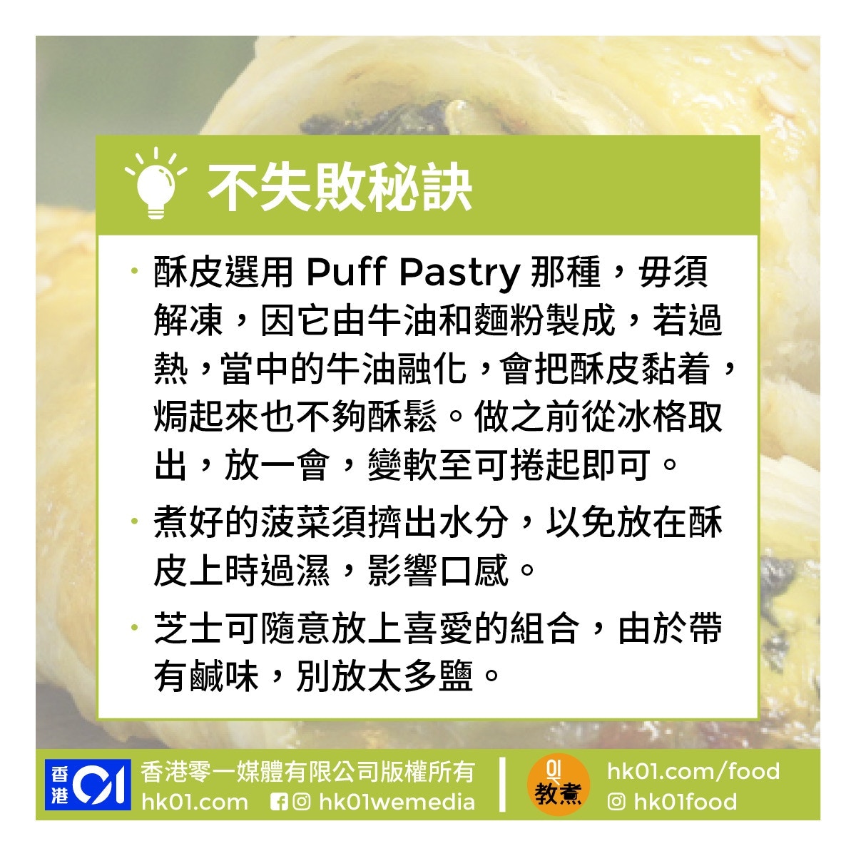 【焗爐食譜】菠菜芝士酥皮卷香脆惹味 酥皮鬆得起應該點處理?