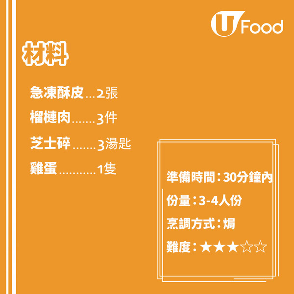 榴槤配芝士新個組合出奇地夾,包入酥皮焗到金黃酥脆,食落啖啖香濃榴槤蓉,趁熱食口感更好!