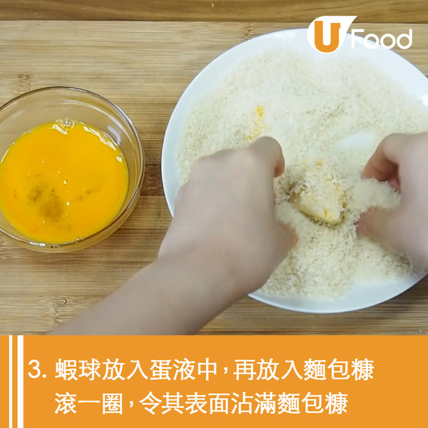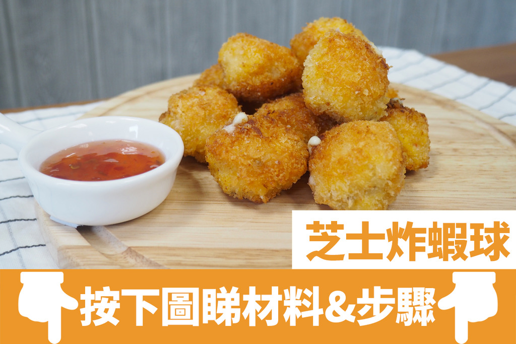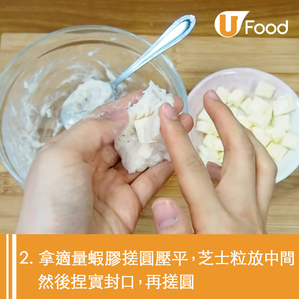 芝士蝦球製法看似複雜,其實只要4步就可以輕鬆完成!把芝士釀入蝦膠中,新鮮炸好的蝦球熱辣辣,咬開更有流心芝士效果,芝士控必試!