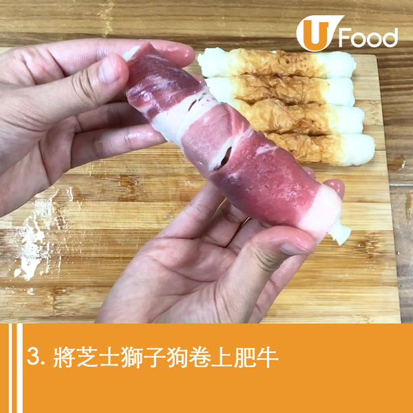 超市買的芝士竹輪價錢偏貴,在家DIY慳錢之餘,又可以配搭其他食材。這款芝士竹輪卷以獅子狗及芝士自製,再用肥牛包裹煎香,灑上孜然粉份外惹味!
