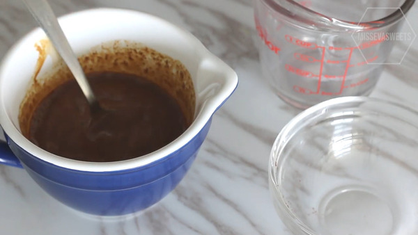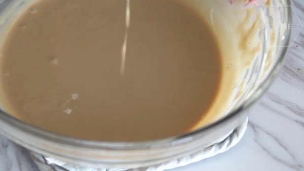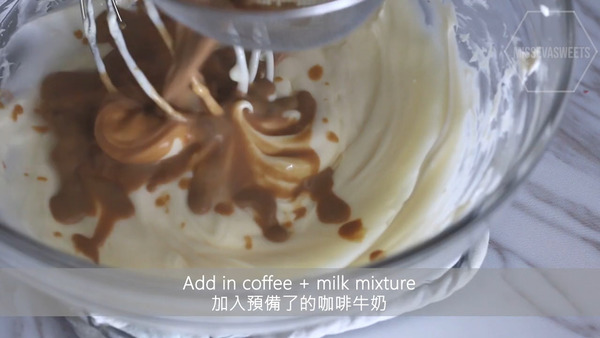 5. 打軟忌廉芝士,加入砂糖攪拌至順滑,再混合分次咖啡牛奶、魚膠溶液