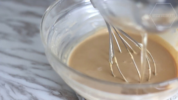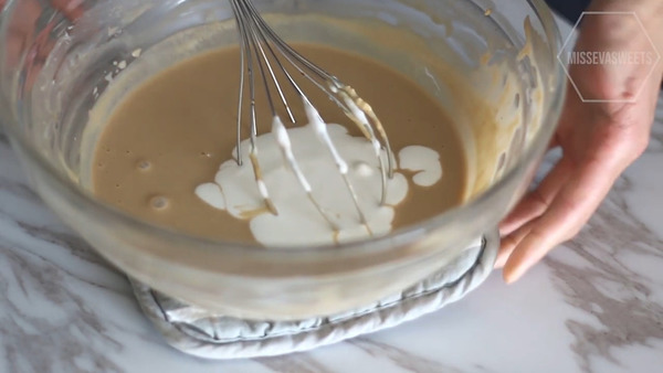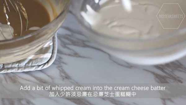 6. 加入少許淡忌廉到蛋糕糊中混合,再將蛋糕糊倒入淡忌廉中攪拌均勻
