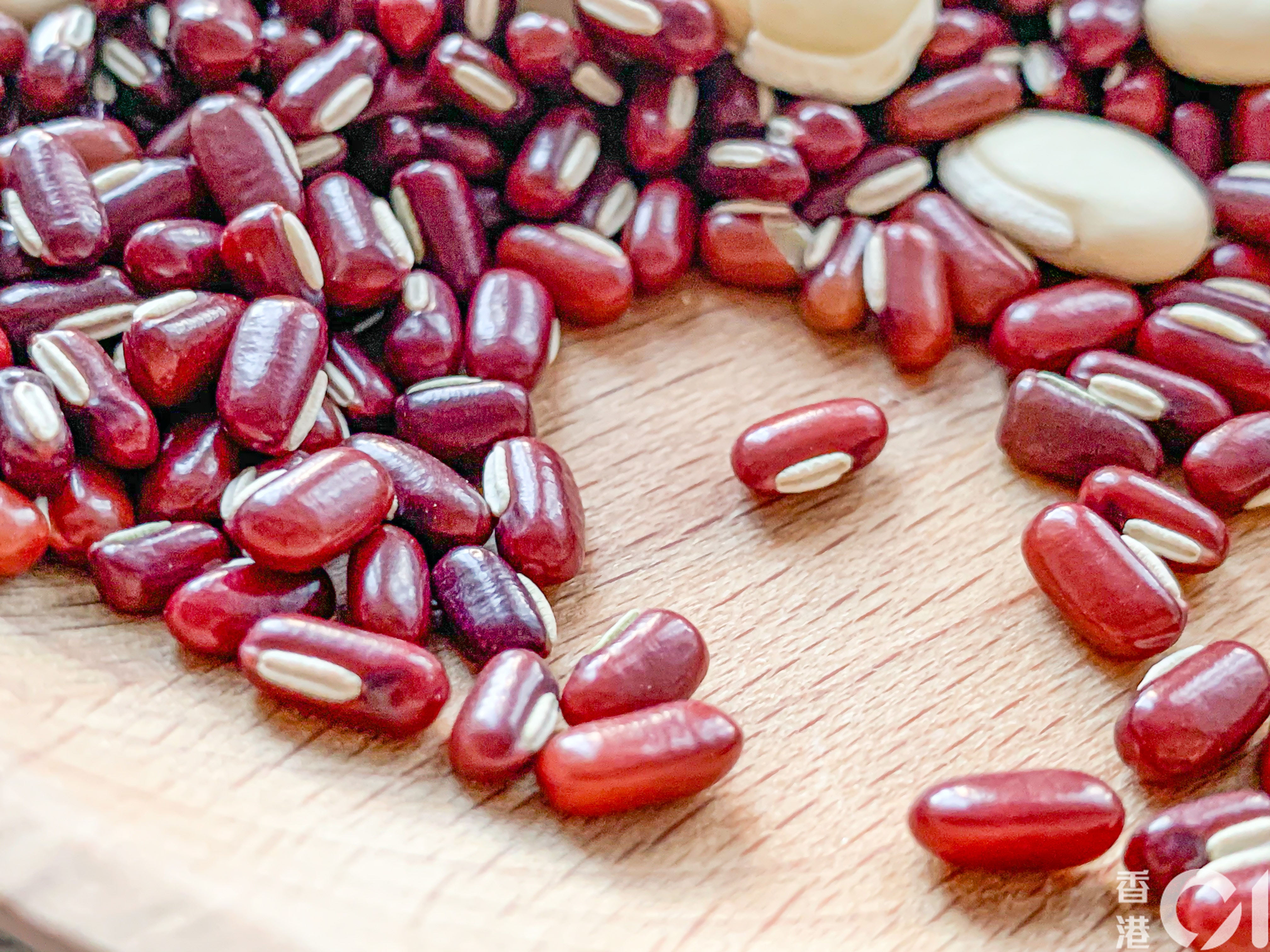 上圖是赤小豆,赤小豆與紅豆不同,赤小豆的豆身修長,顏色為暗棕紅色,久煮不爛;紅豆的豆身橢圓形,深紅色,易煮爛。