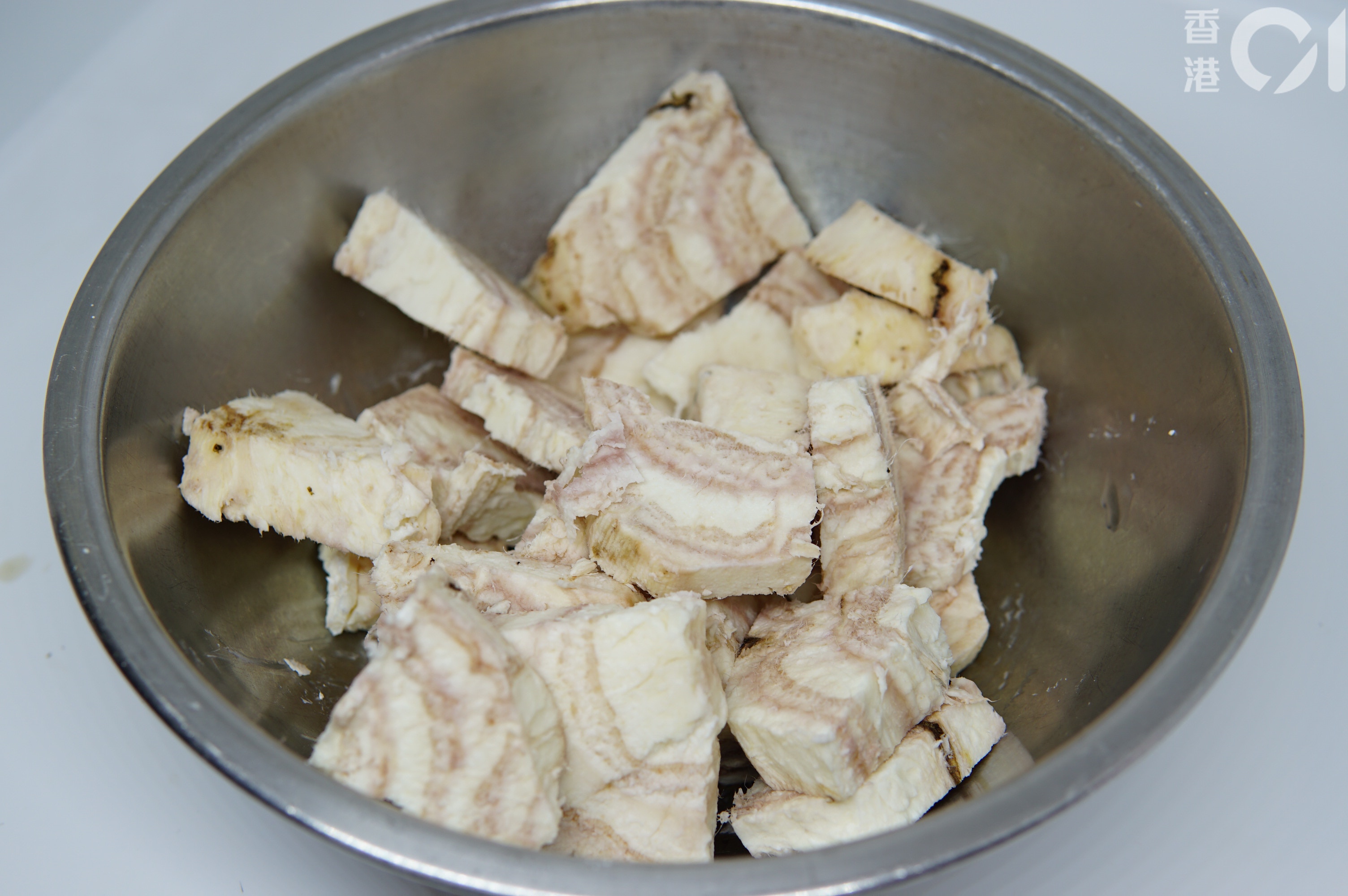粉葛雖像芋頭,它的皮硬實得多,加上粉葛外型凹凸不平,去皮時很難完全去得乾淨。這次筆者為了拍攝,就買了半個粉葛自己削皮,不過要是你想偷懶,部分菜販可幫你削皮,他們較熟手,按著粉葛頂,用刀仔輕輕鬆鬆就將粉葛皮扯出,比用刨還有效率。