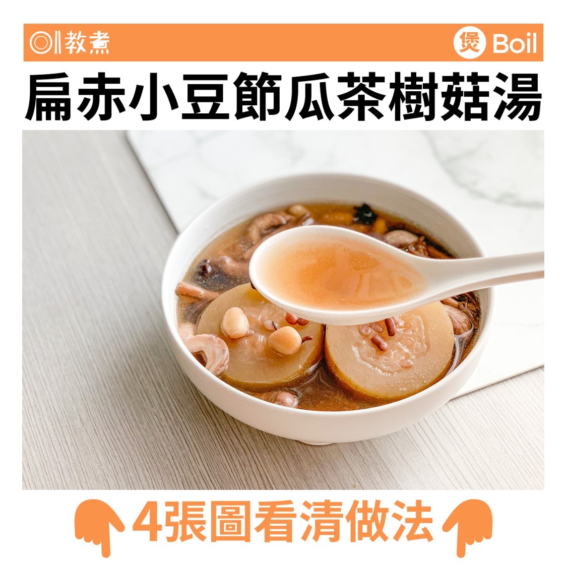 扁赤小豆節瓜茶樹菇湯,可理氣健脾,化濕消暑,一家大小可服,材料易見易買,絕對是家常靚湯。