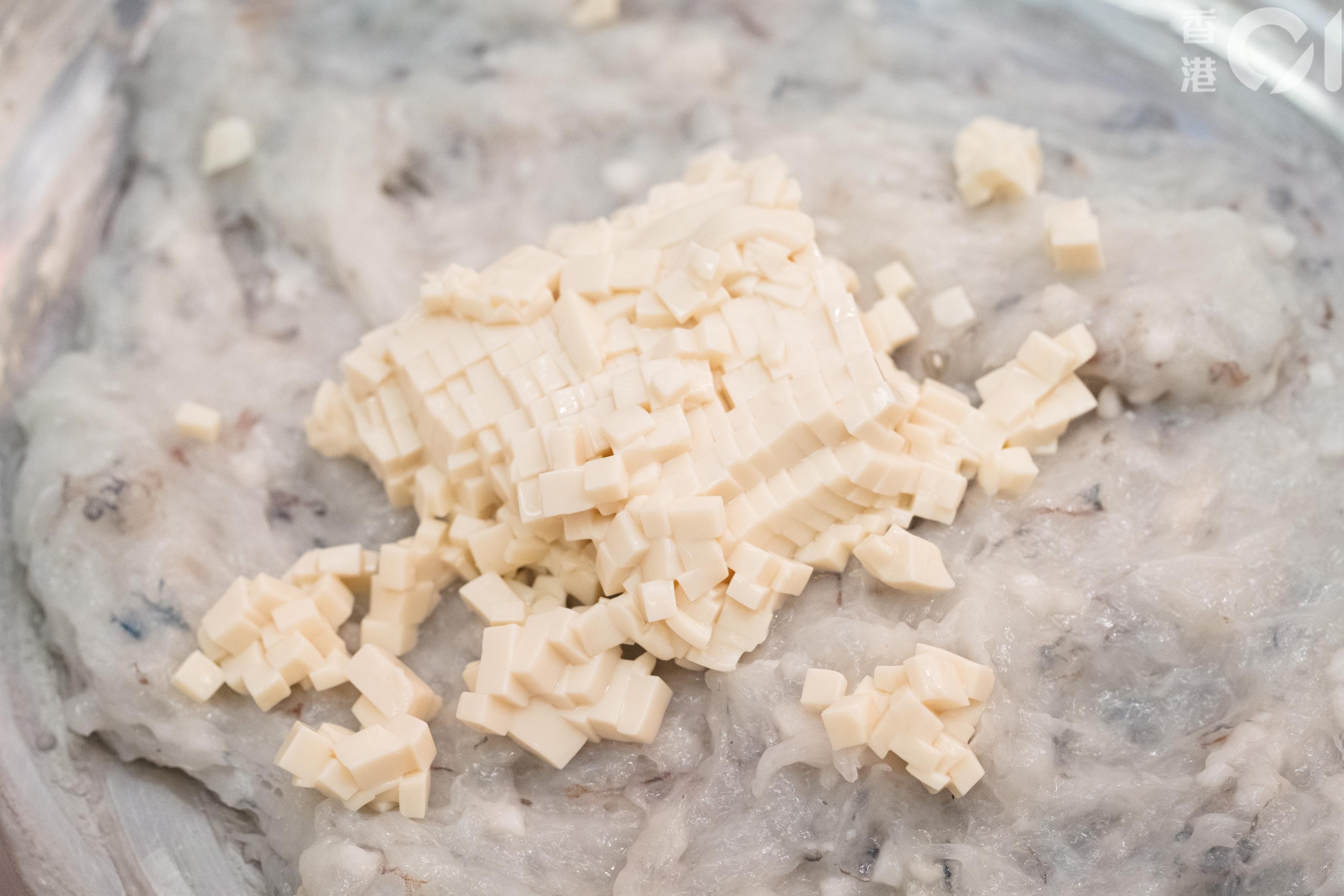 雷師傅把豆腐切成細粒,準備與蝦膠拌勻。