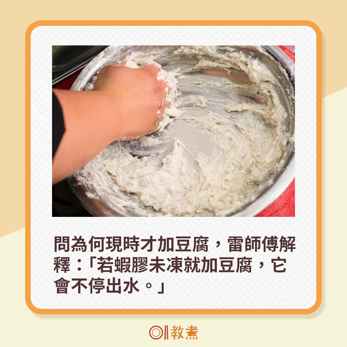 打蝦膠的部分大致完成,接下來可再把蝦膠冷藏1小時,準備開始煮蝦膠。你可以將蝦膠搓成蝦餅、蝦丸等,或是把蝦膠釀在冬菇或其他食材等。雷師傅的刀功素來有一手,曾在毛記電視的節目《國家級任務》示範將豆腐切成花狀,極幼絲的嫩豆腐在水中化開,是為「文思豆腐羹」。今次雷師傅亦會將豆腐切成碎粒,與蝦膠拌勻,問到為何有這個構思,他說:「蝦膠其實『包得住』許多食材,混和豆腐是為了吃出蝦的鮮味、豆腐的軟滑,只要把豆腐完全捽爛,讓它融在蝦膠裡便行。」