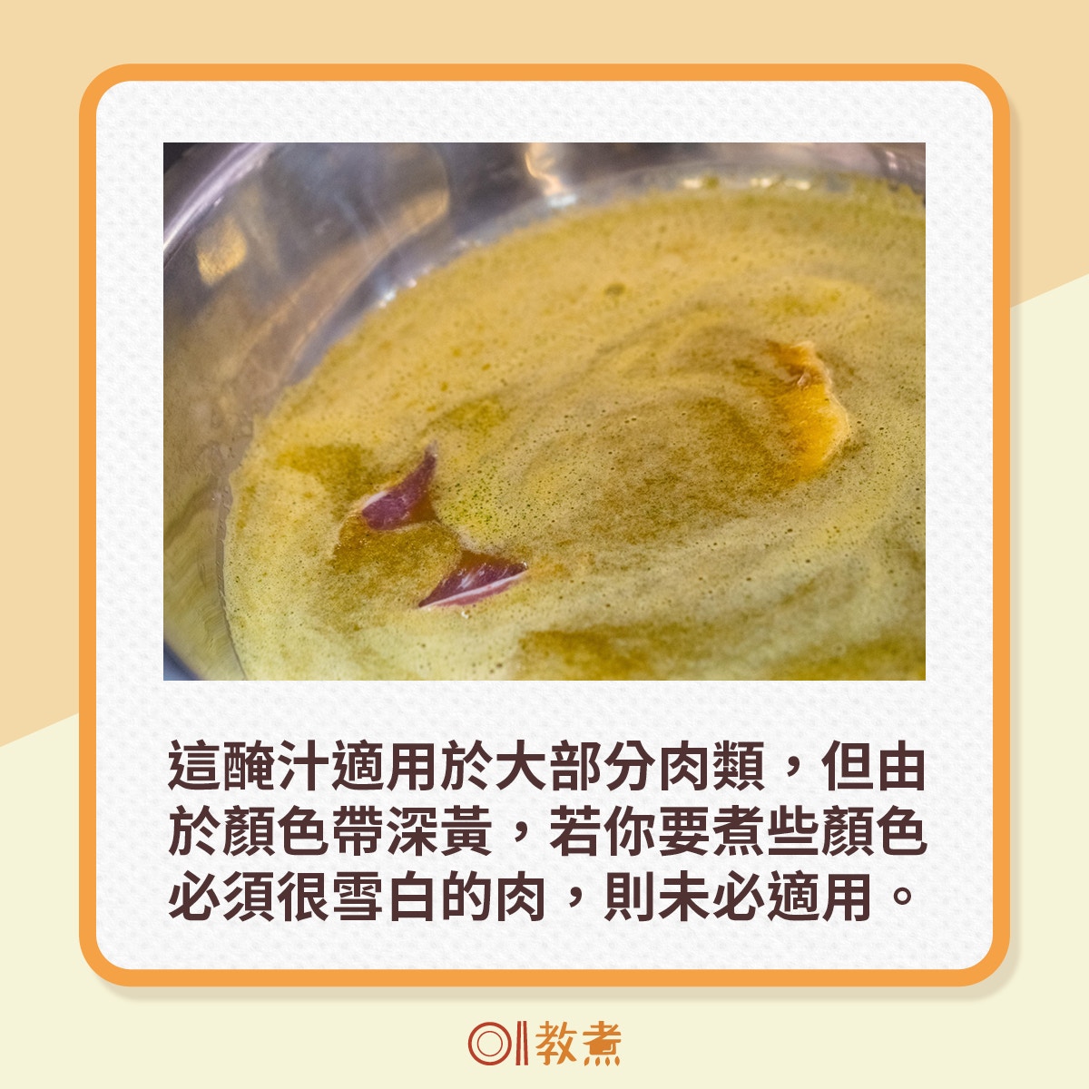 這次雷師傅示範的是最簡單的煎豬扒,由於醃汁本身帶黃,煎的時候,筆者也一度擔心會影響色澤,不知道豬扒成品會否像咖喱豬扒。不過,煎好之後,它的顏色與賣相卻非常好,金黃帶啡,微微焦香又不會太燶,吃起來也是鬆軟滑嫩。